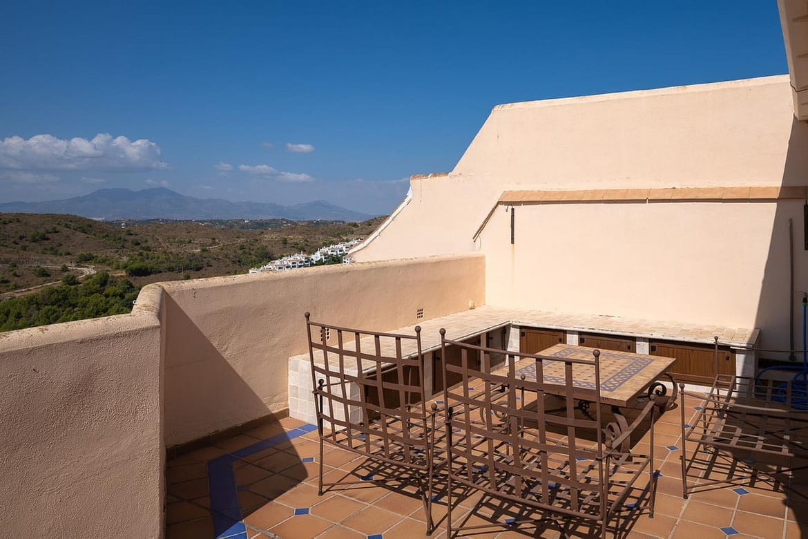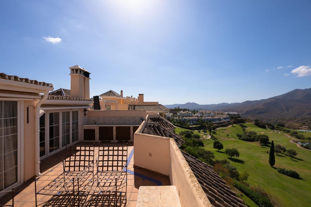 Stunning duplex in Alhaurin Golf with exceptional views of the golf course and in an impeccable condition. The property is very spacious and consists of a large living-dining room with a fireplace opening onto a fabulous and spacious fully glazed terrace with spectacular views of the course. There is also a large fully equipped kitchen as well as two double bedrooms, one en suite and with direct access to the terrace as well as a second bathroom. Upstairs there is a third bedroom and another bathroom and an additional bonus is a second summer lounge ideal for family gatherings. From here we access to a beautiful terrace with a barbecue area and unbeatable 360º views. Also there is a parking space, storage room, swimming pool and communal gardens. A property with many possibilities and great potential.