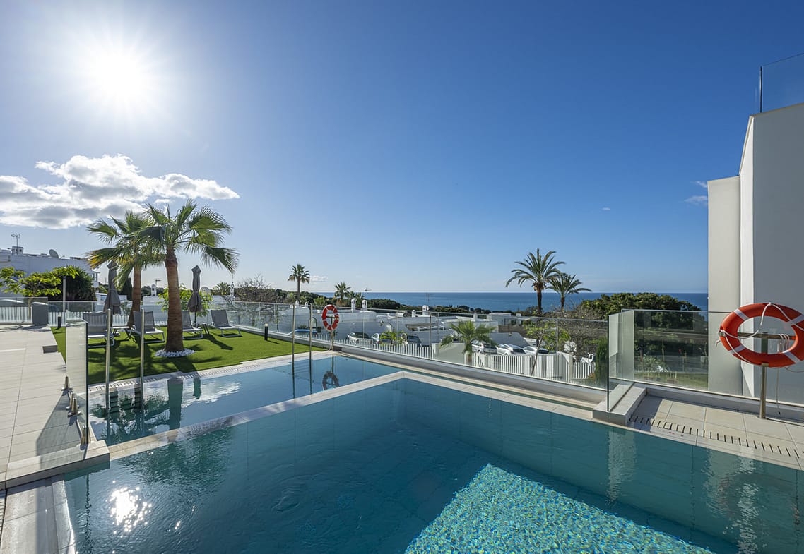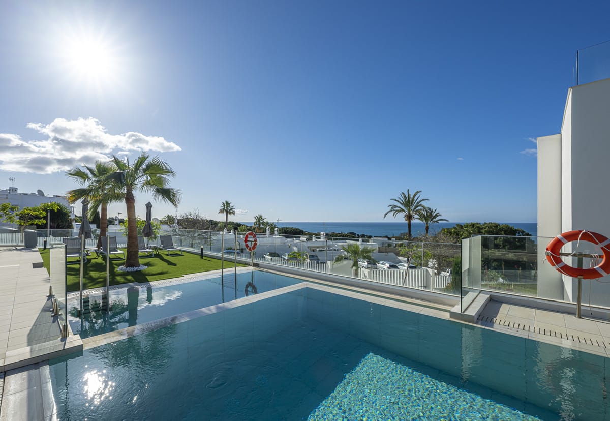 Nestled within a secure and serene gated community in Artola Alta, this sophisticated south-facing corner duplex offers an exceptional lifestyle just minutes from Marbella’s finest beaches. The residence enjoys access to resort-style amenities including two outdoor swimming pools, a heated indoor pool, gym, sauna, and a full-time concierge—creating a truly elevated living experience framed by panoramic views.