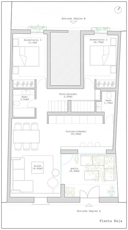 The ground floor features a spacious open-plan living, dining, and kitchen area, which opens onto a charming 14 m² interior patio that provides abundant natural light and ventilation. This level also includes two bedrooms, a full bathroom, and a guest toilet.