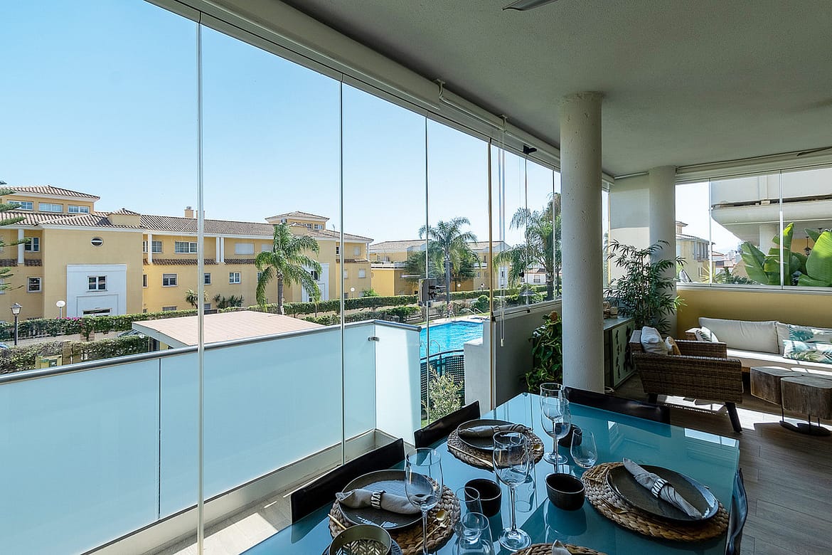 living, with wide views of the large communal pool, well maintained buildings and