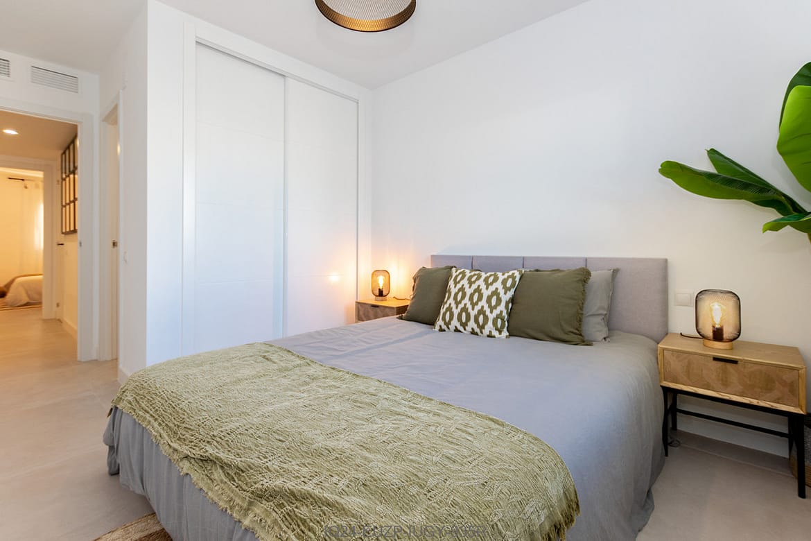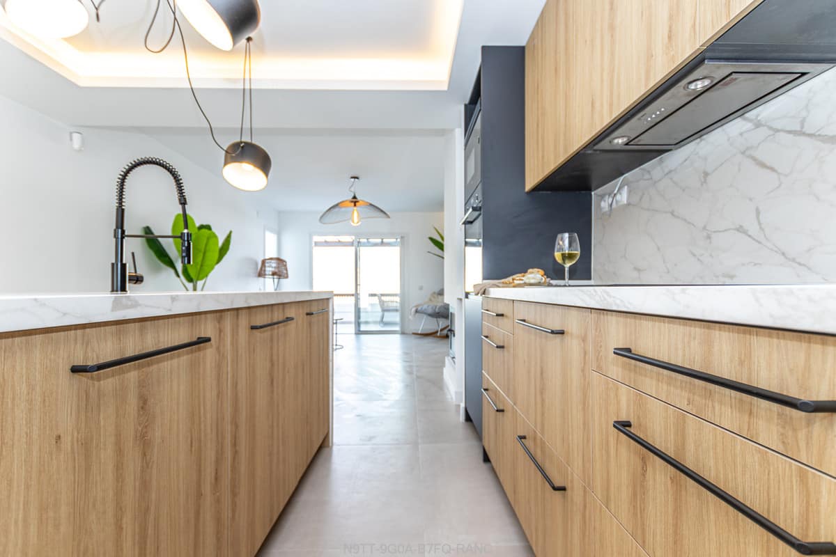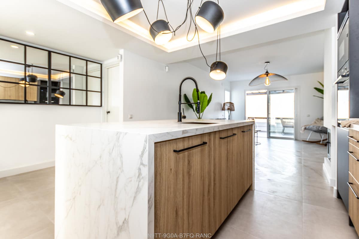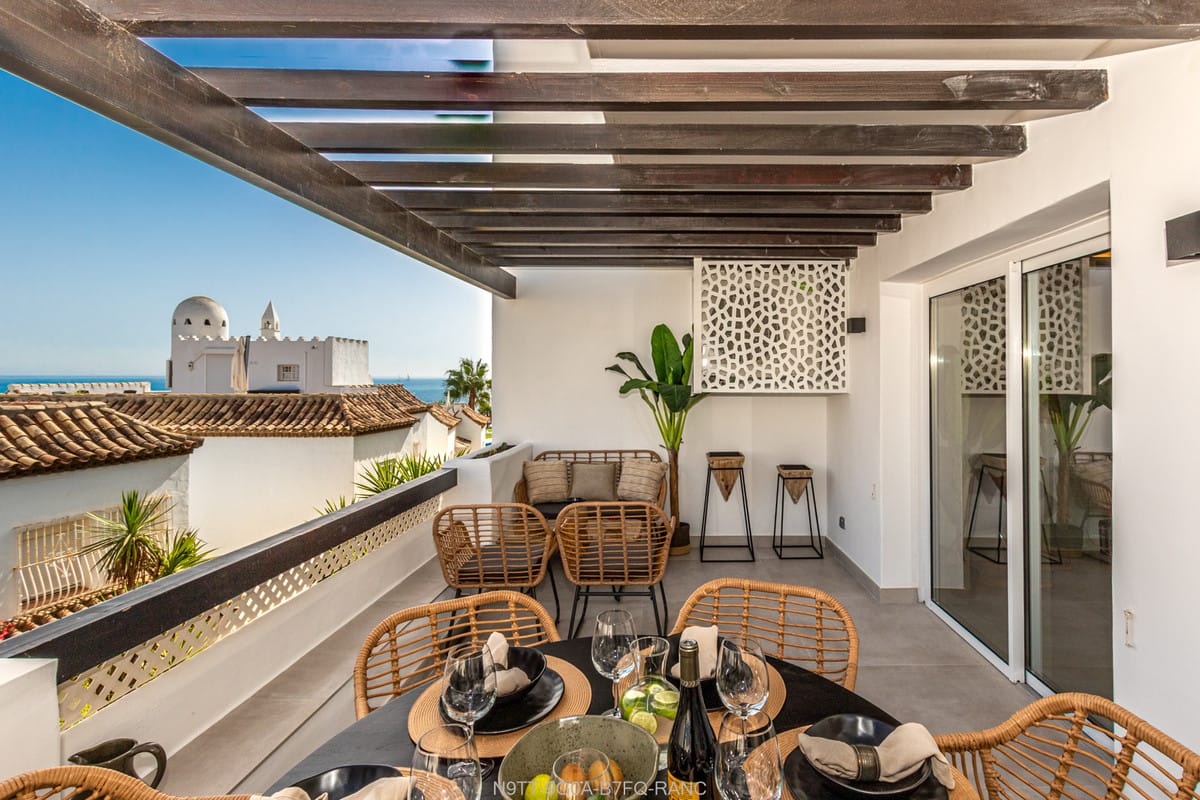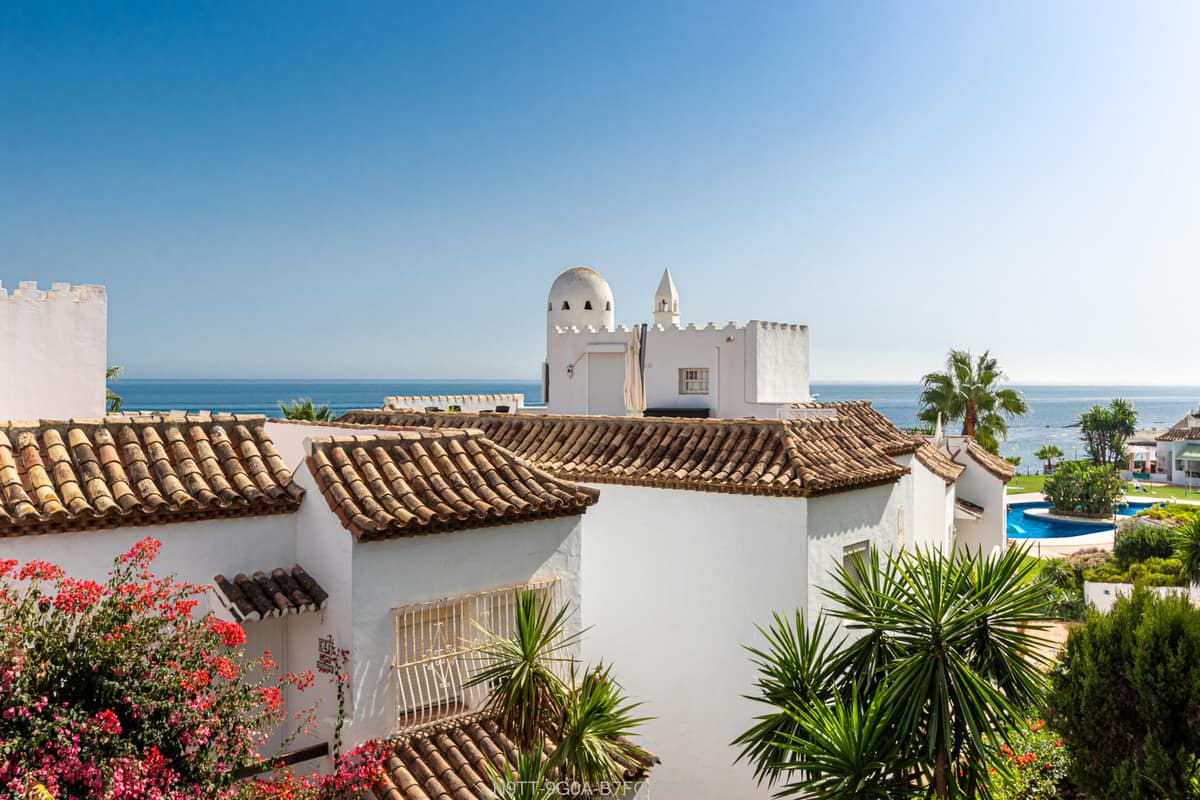 Spacious 3 bedroom apartment with 2 full bathrooms with walk-in showers in a beachfront complex with south orientation and sea views in Calahonda, Mijas Costa for sale fully refurbished in modern scandinavian style, completely furnished and fitted ready to move in.