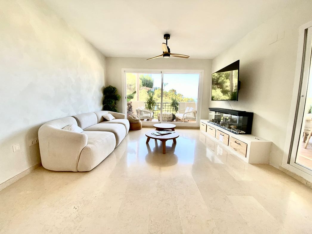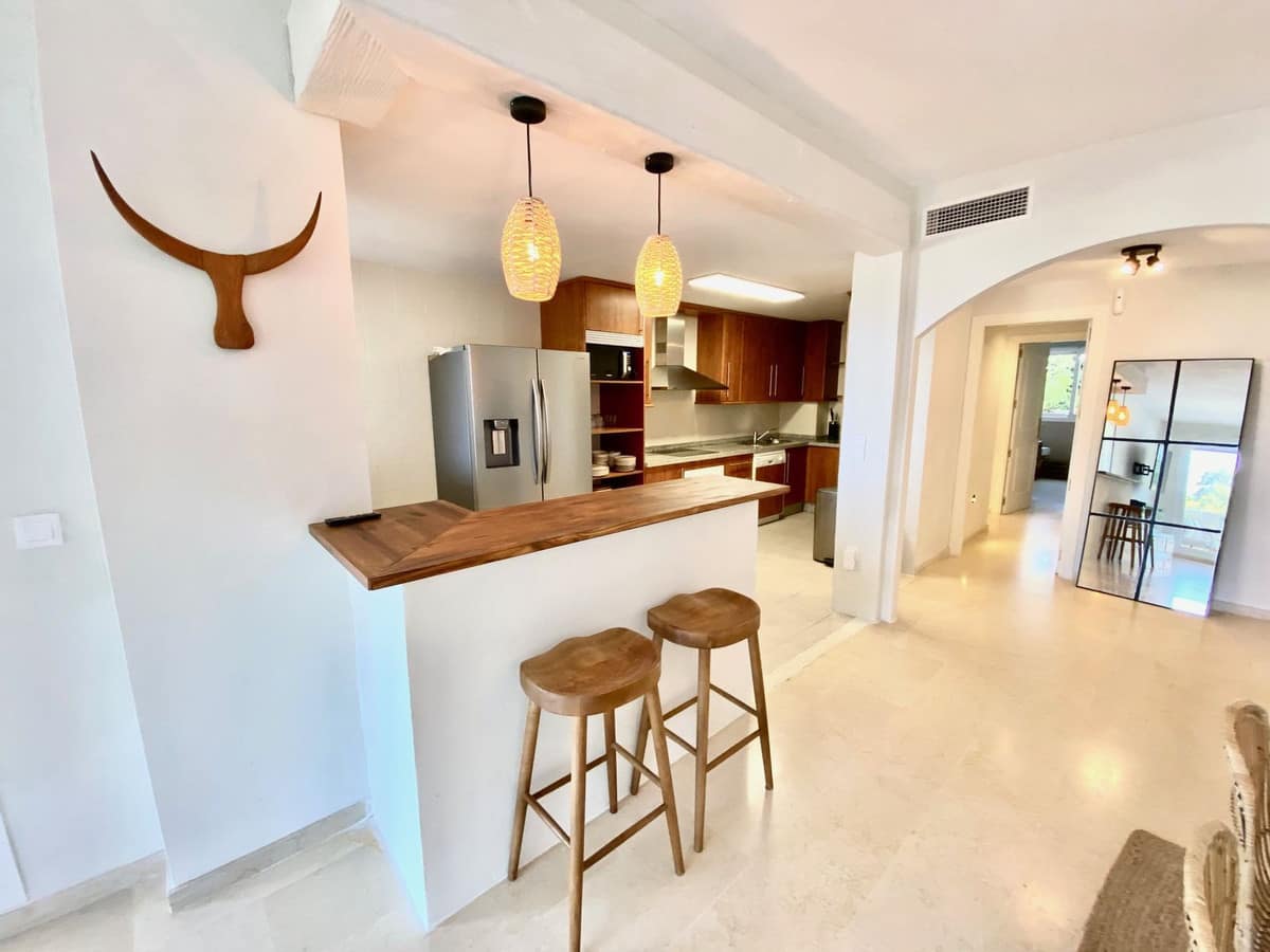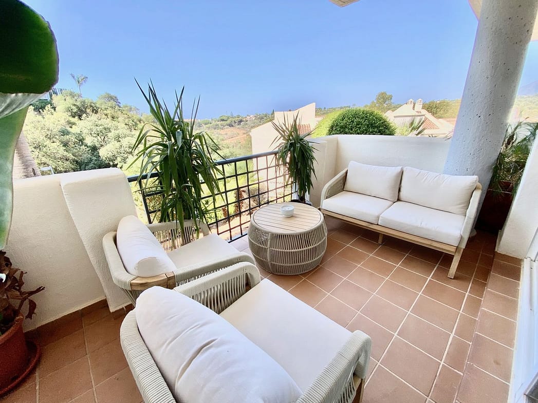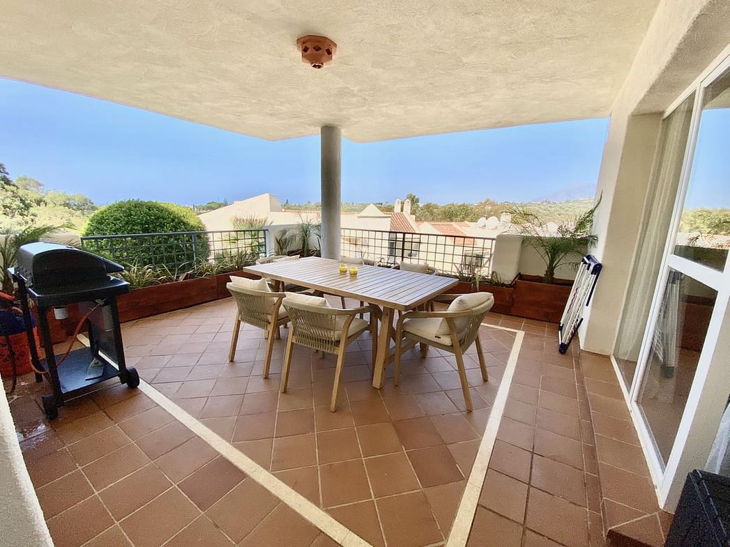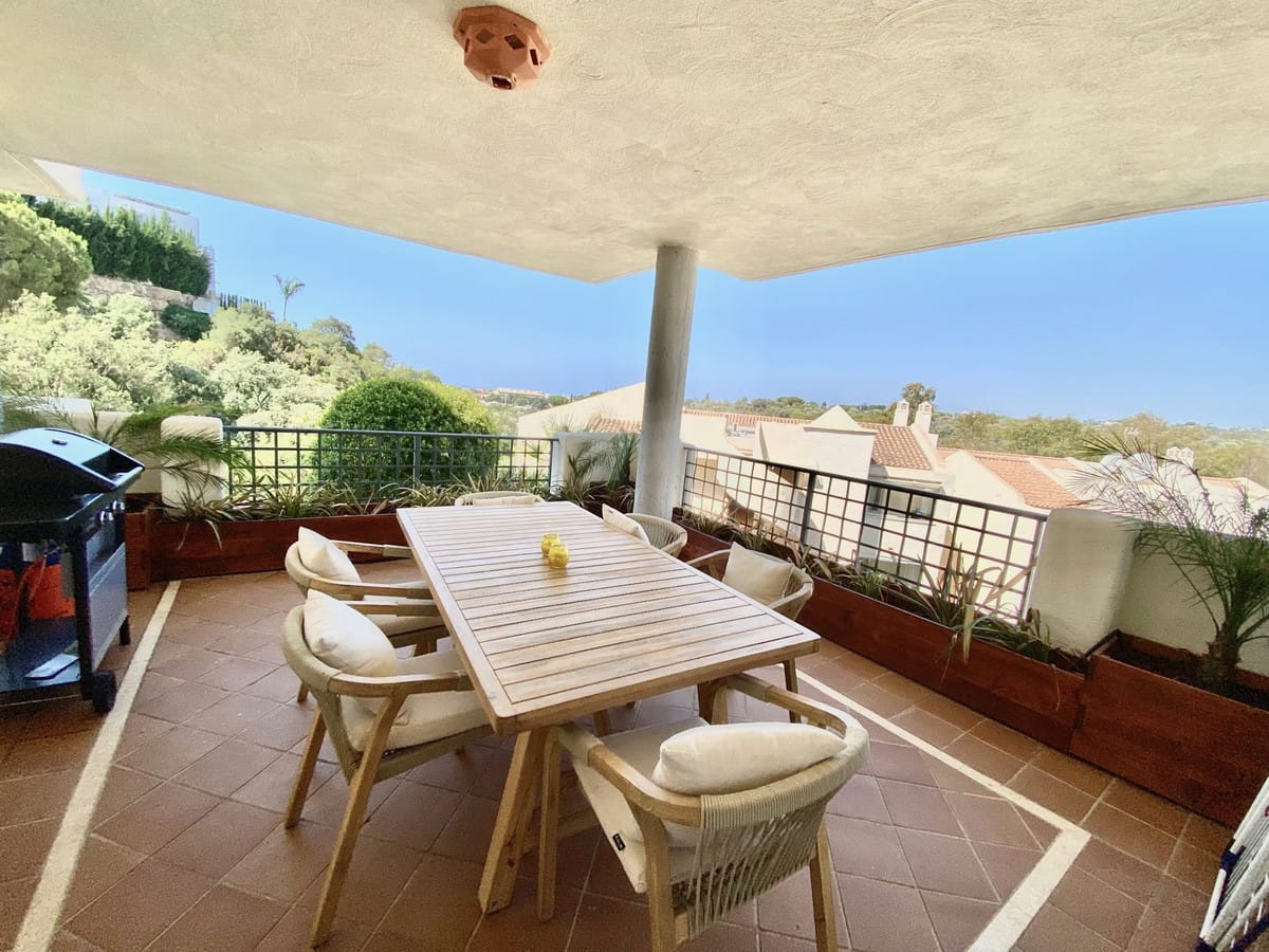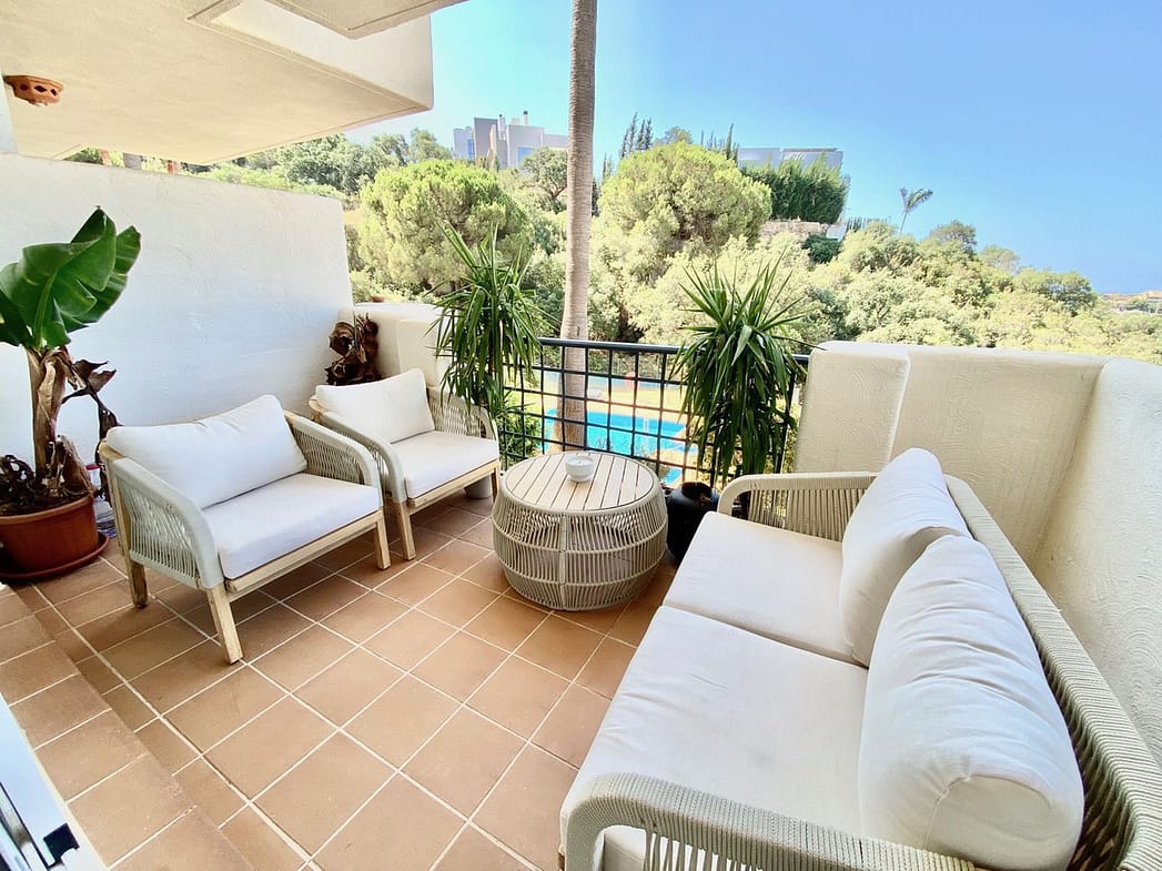 Furnished apartment has 3 bedrooms, the master bedroom with its en-suite bathroom and access to the terrace, 2 bathrooms, living room with open kitchen and with access to 2 terraces, a smaller one facing south with views of the pool and another larger one with its barbecue facing south and west with views of the garden and partial views of the sea.
