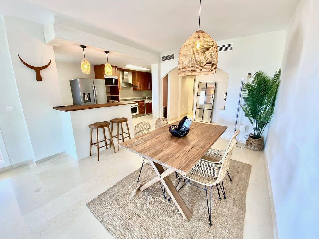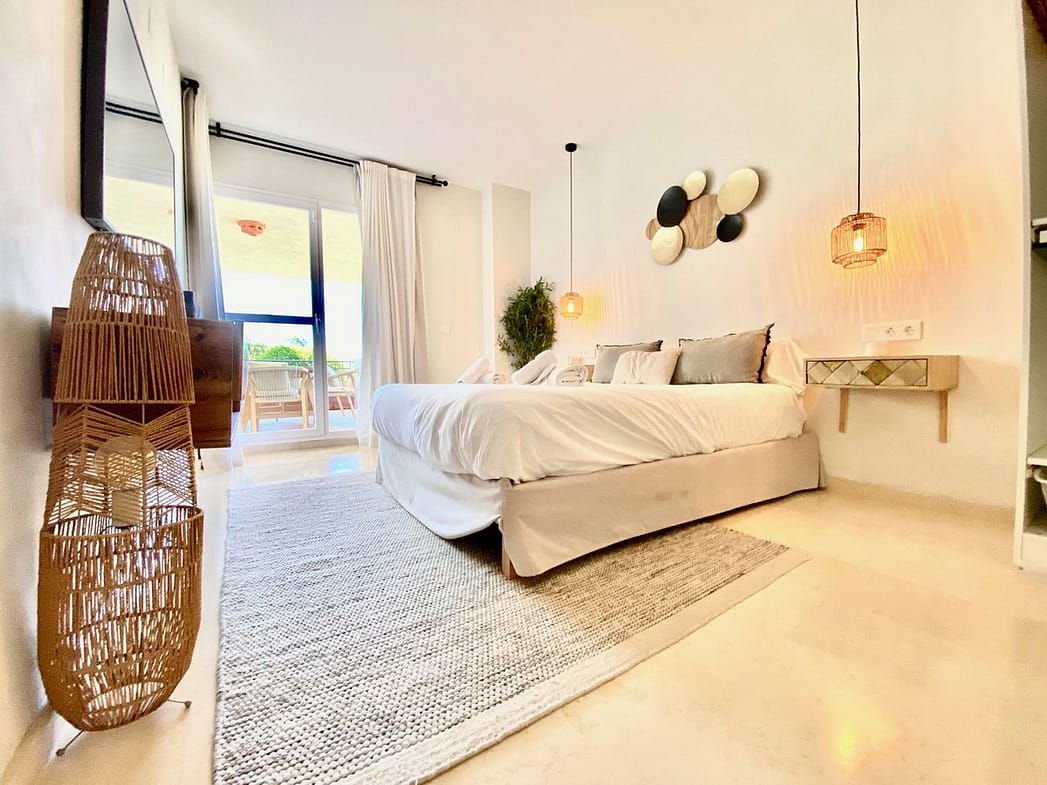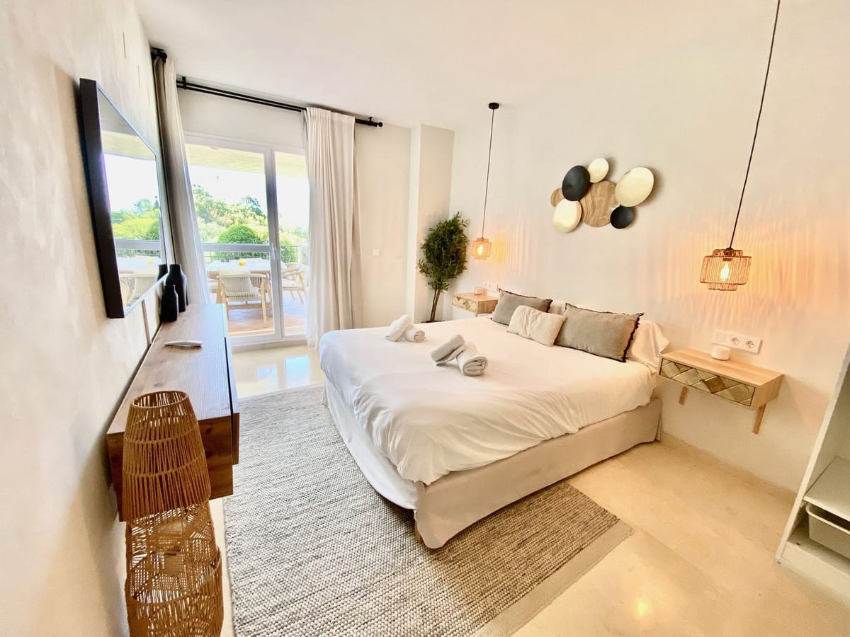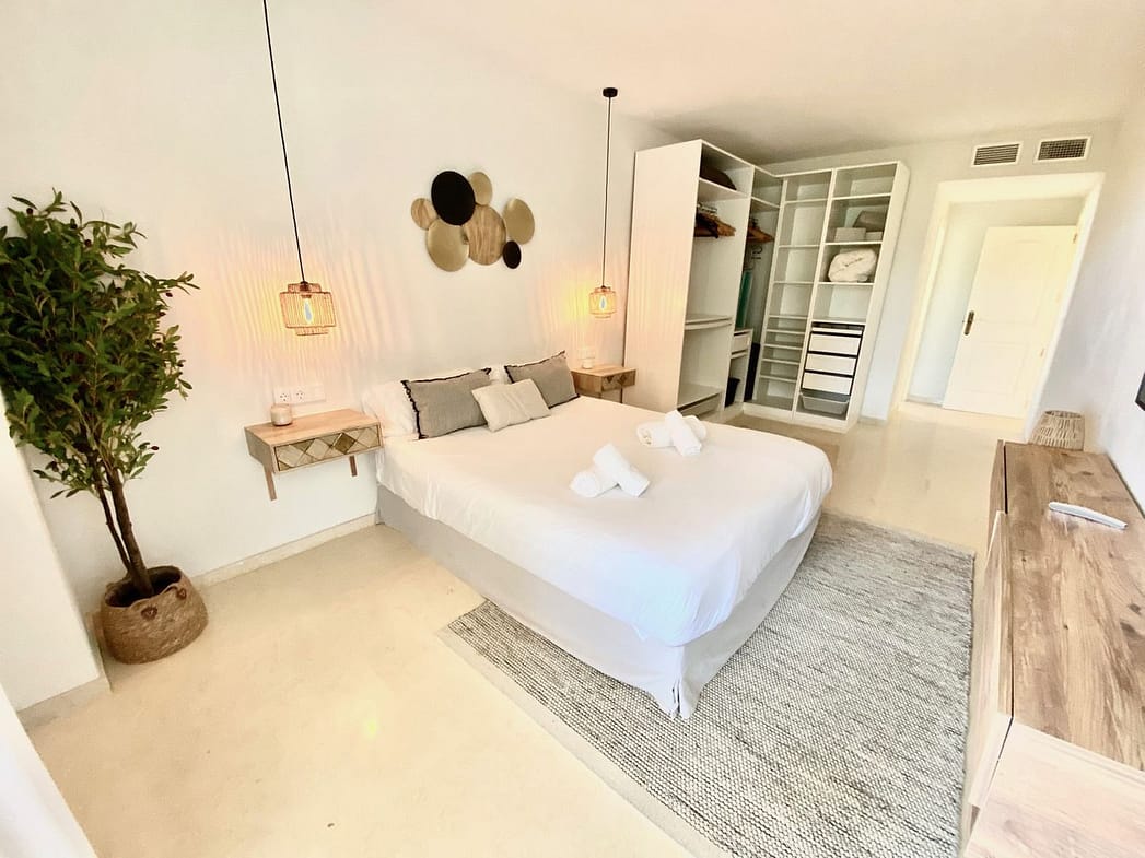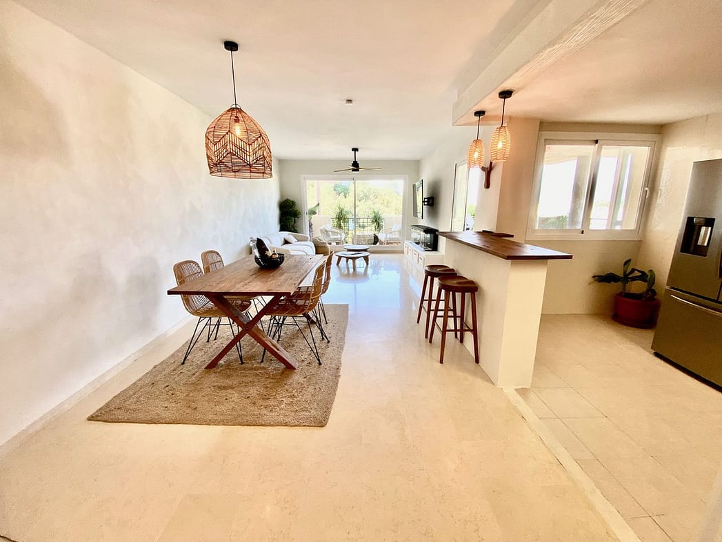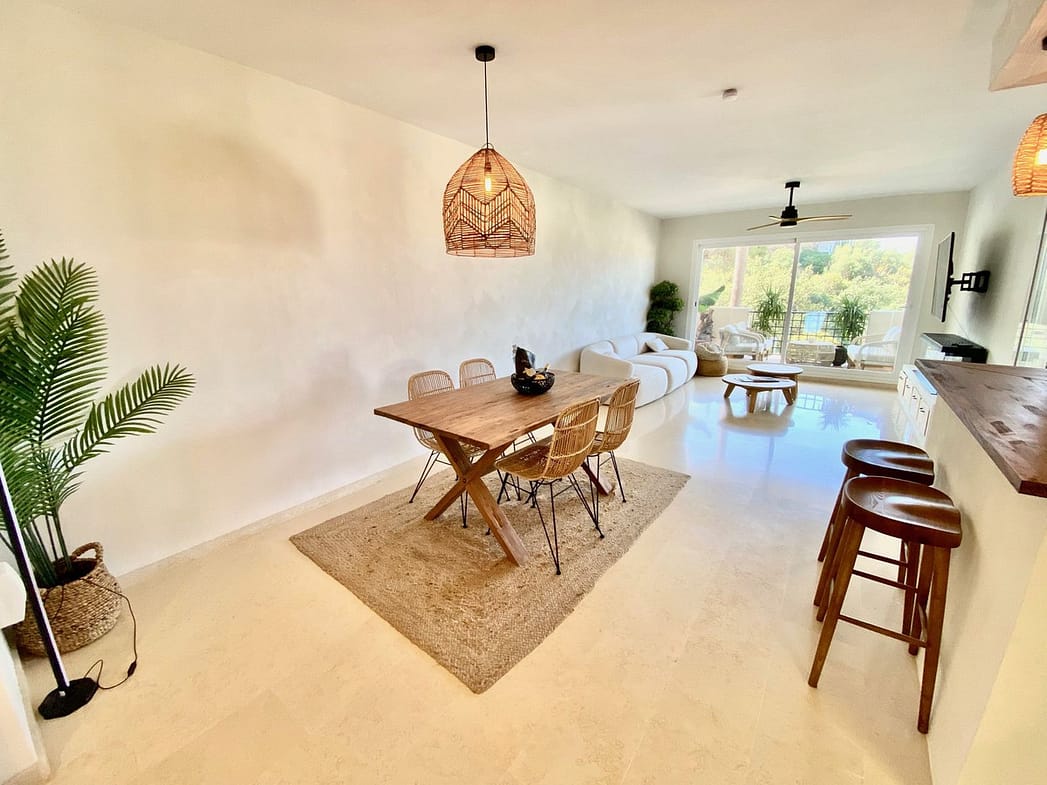 Furnished apartment has 3 bedrooms, the master bedroom with its en-suite bathroom and access to the terrace, 2 bathrooms, living room with open kitchen and with access to 2 terraces, a smaller one facing south with views of the pool and another larger one with its barbecue facing south and west with views of the garden and partial views of the sea.