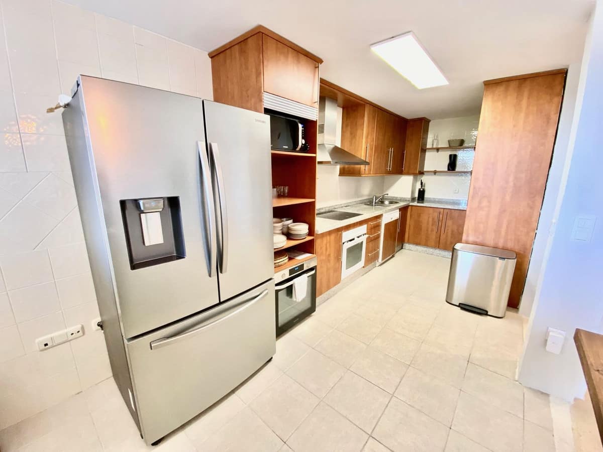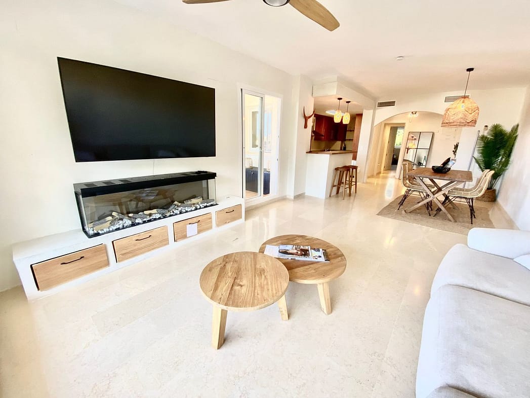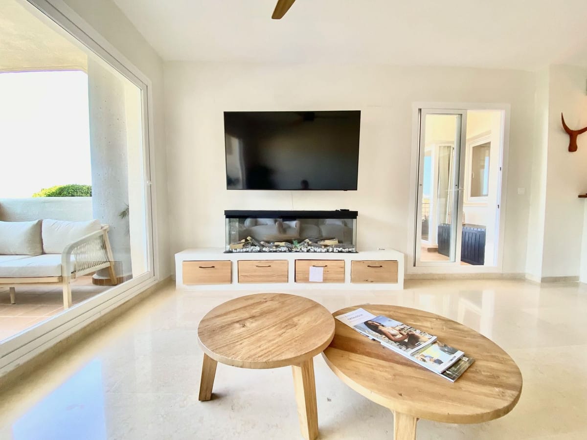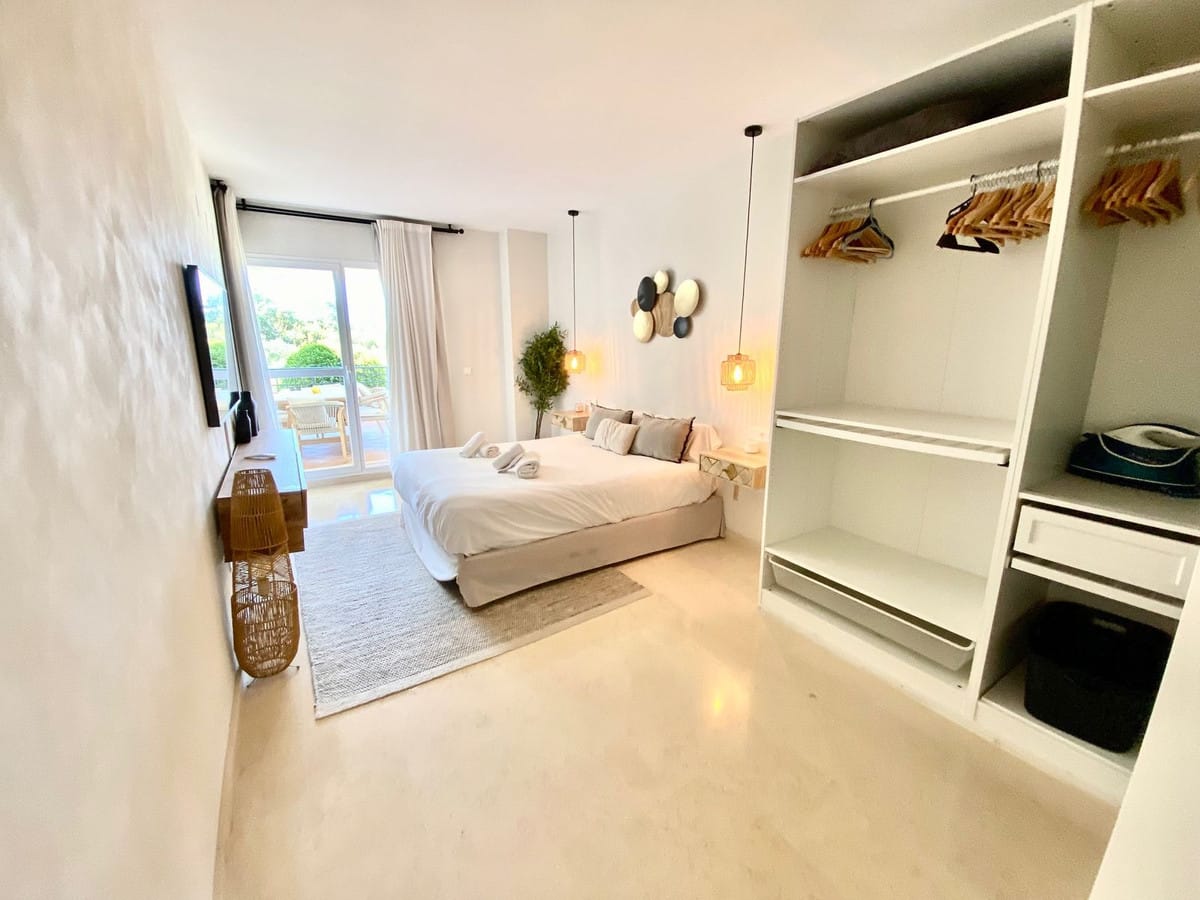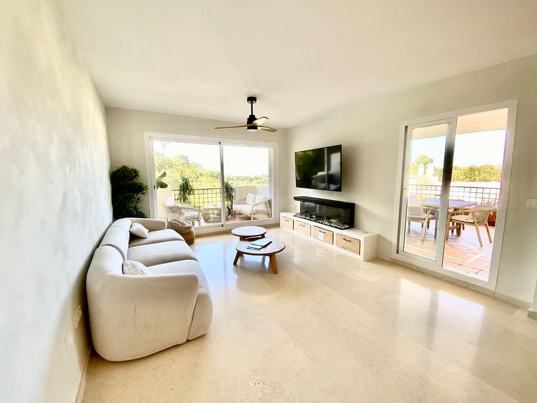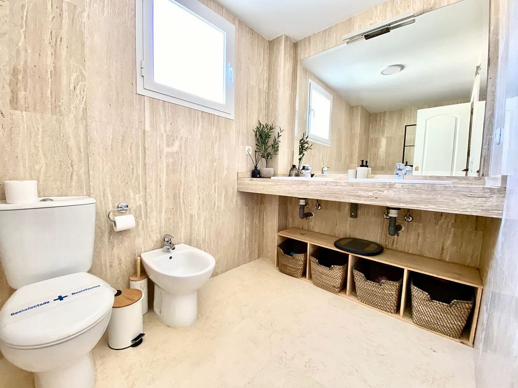 Furnished apartment has 3 bedrooms, the master bedroom with its en-suite bathroom and access to the terrace, 2 bathrooms, living room with open kitchen and with access to 2 terraces, a smaller one facing south with views of the pool and another larger one with its barbecue facing south and west with views of the garden and partial views of the sea.