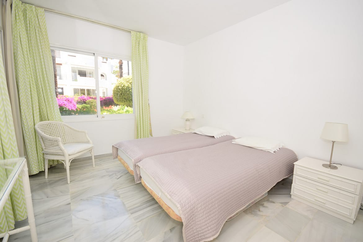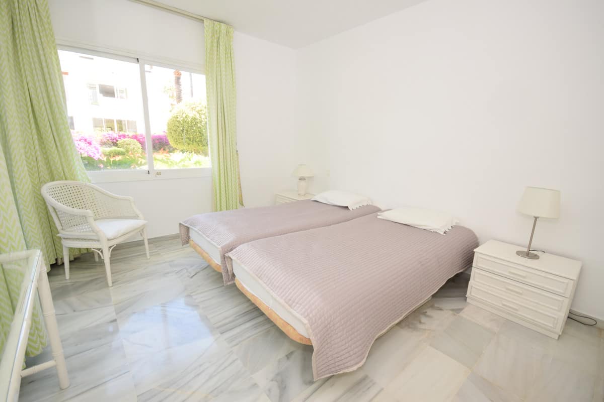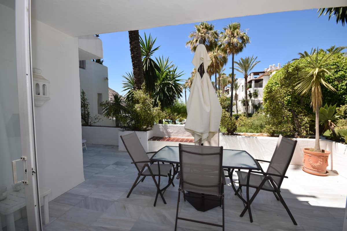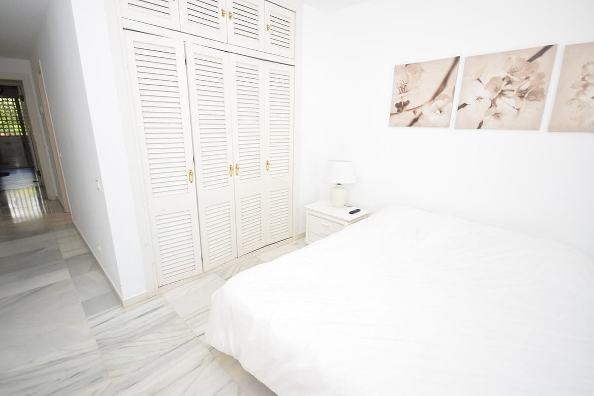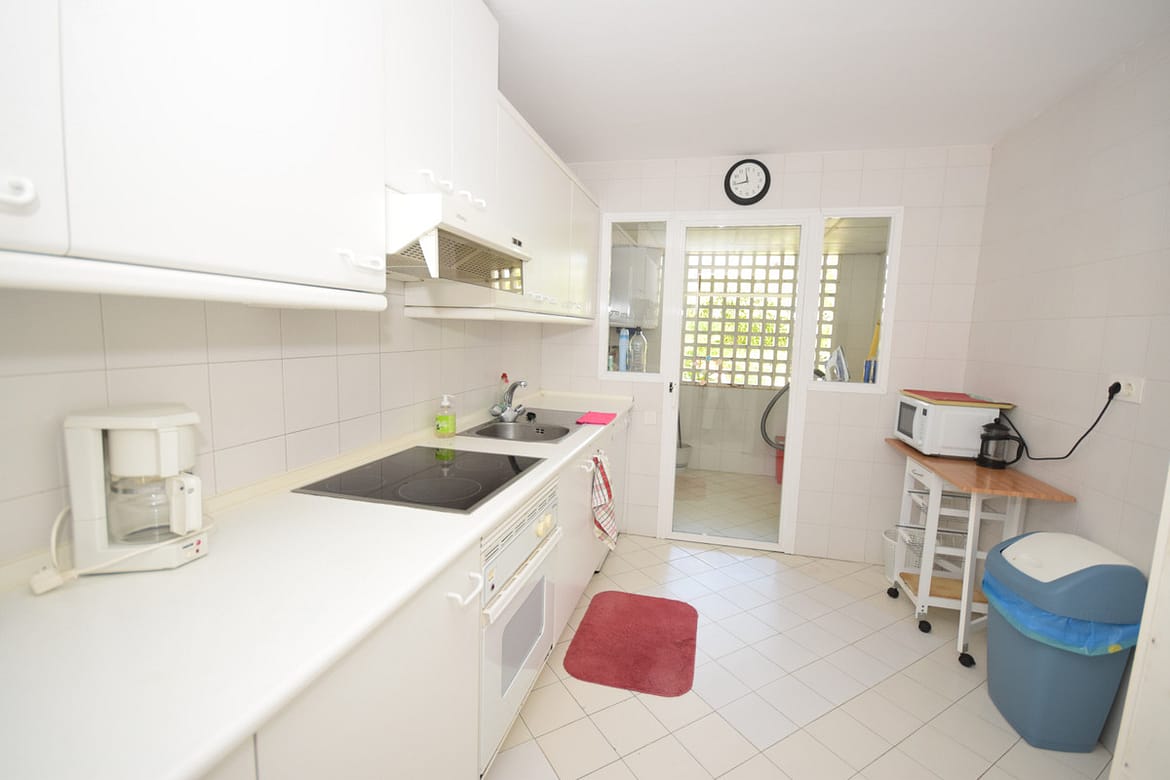 Nice west-facing corner ground floor apartment in Alcazaba Beach, Estepona. The apartment has big terraces with views to the garden and the pool. The apartment consists of 3 bedrooms and 3 bathrooms, dining and living area, kitchen and terraces. This front line beach complex is located in Estepona Alcazaba Beach with installations such as: 7 pools (1 heated), paddle, tennis and basketball courts, a football field, a beach restaurant (open only Easter – October, exclusively open to the guests). It has a beautiful gardens, tennis and paddel courts and children playground. The apartment has marble floors, en-suite bathrooms, a fully-equipped kitchen, air-conditioning and alarm system. Holiday apartment to let – Alcazaba Beach – Estepona – Costa del Sol – Andalusia – Spain