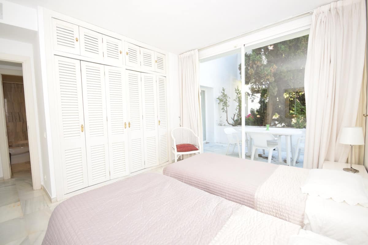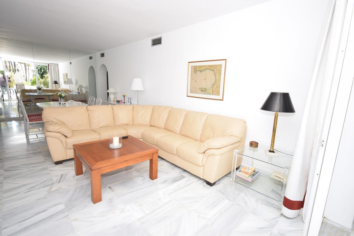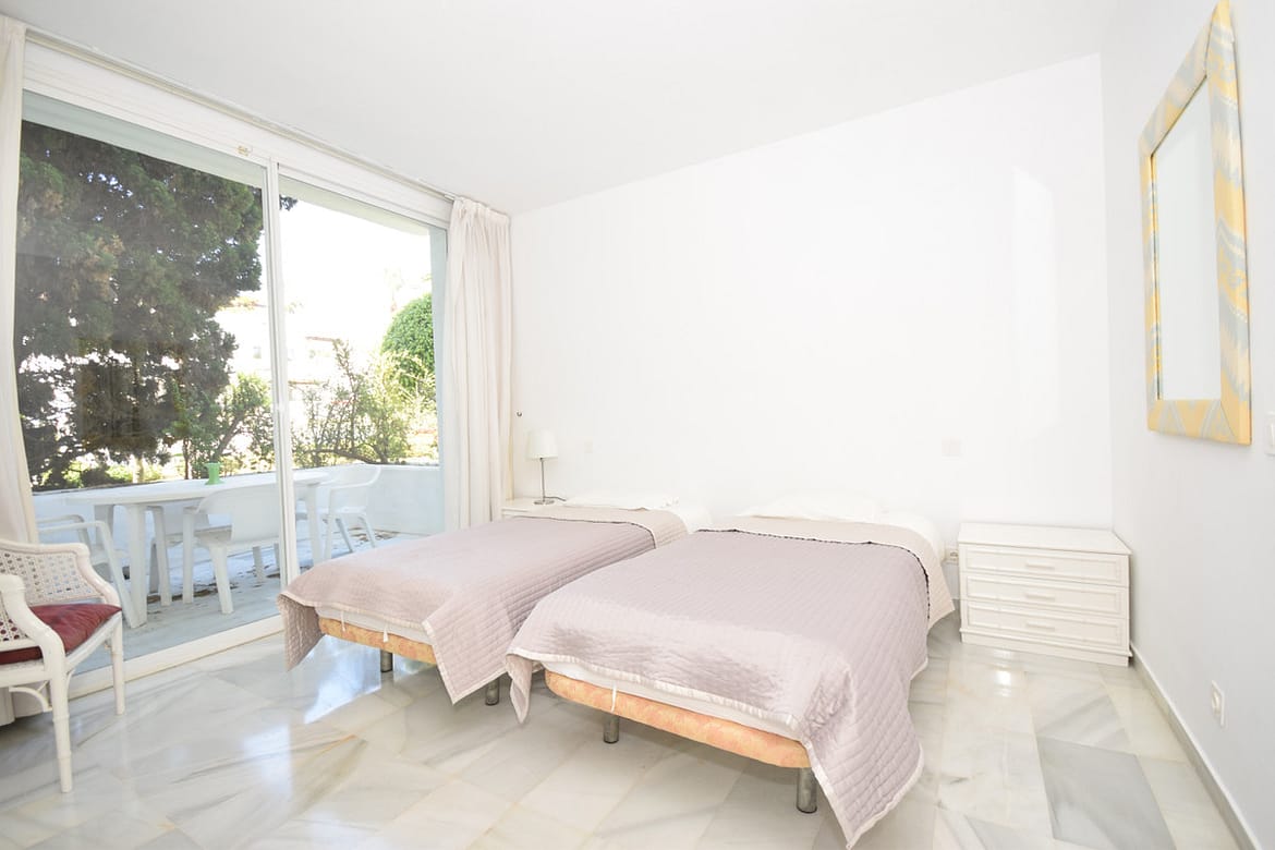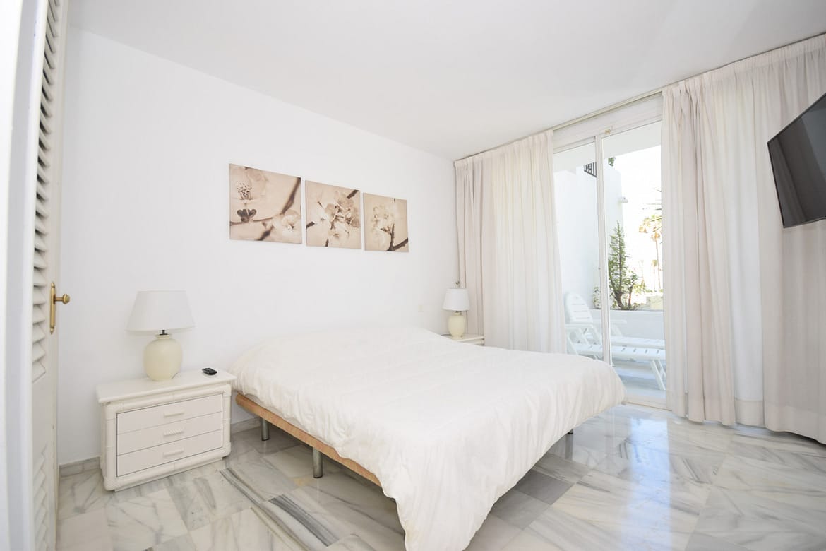 Nice west-facing corner ground floor apartment in Alcazaba Beach, Estepona. The apartment has big terraces with views to the garden and the pool. The apartment consists of 3 bedrooms and 3 bathrooms, dining and living area, kitchen and terraces. This front line beach complex is located in Estepona Alcazaba Beach with installations such as: 7 pools (1 heated), paddle, tennis and basketball courts, a football field, a beach restaurant (open only Easter – October, exclusively open to the guests). It has a beautiful gardens, tennis and paddel courts and children playground. The apartment has marble floors, en-suite bathrooms, a fully-equipped kitchen, air-conditioning and alarm system. Holiday apartment to let – Alcazaba Beach – Estepona – Costa del Sol – Andalusia – Spain