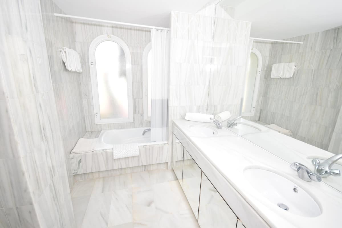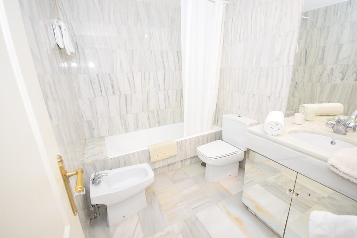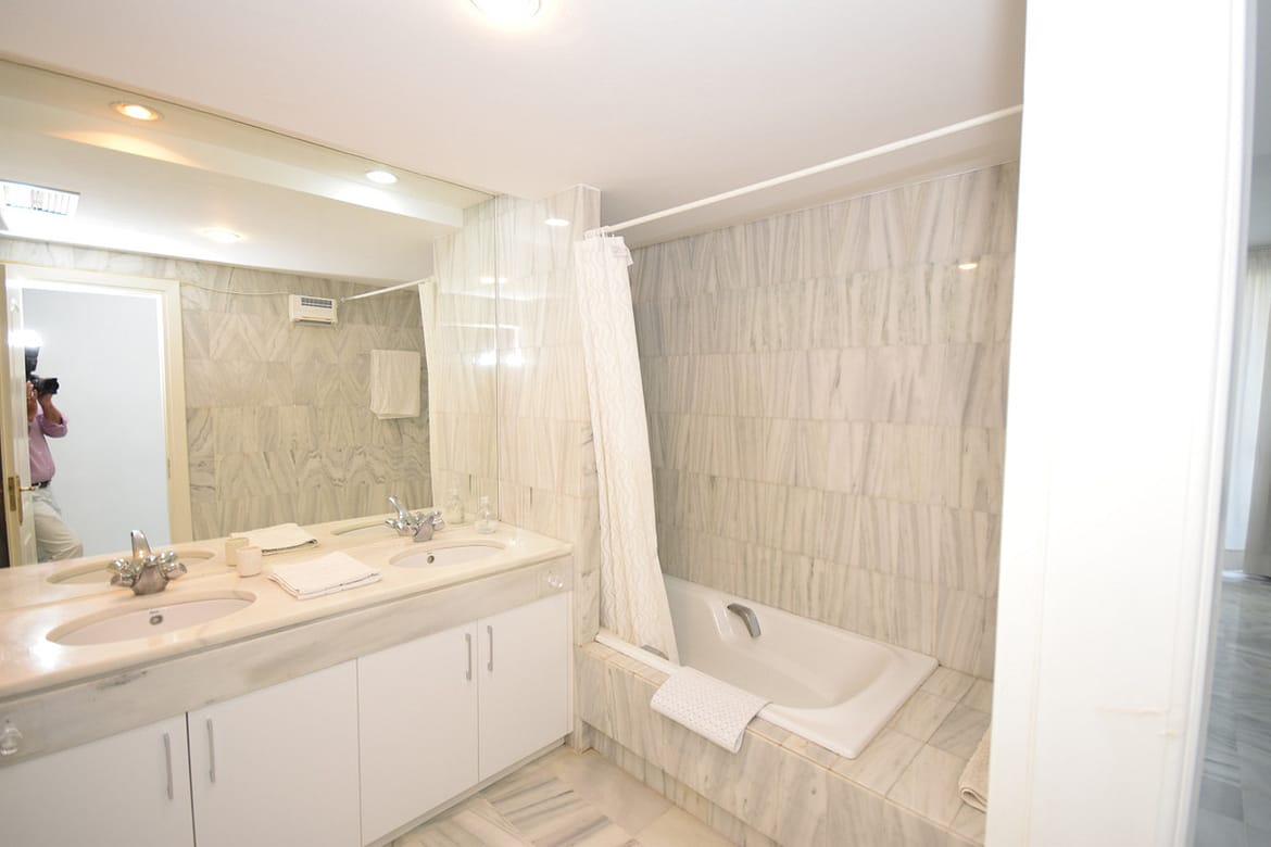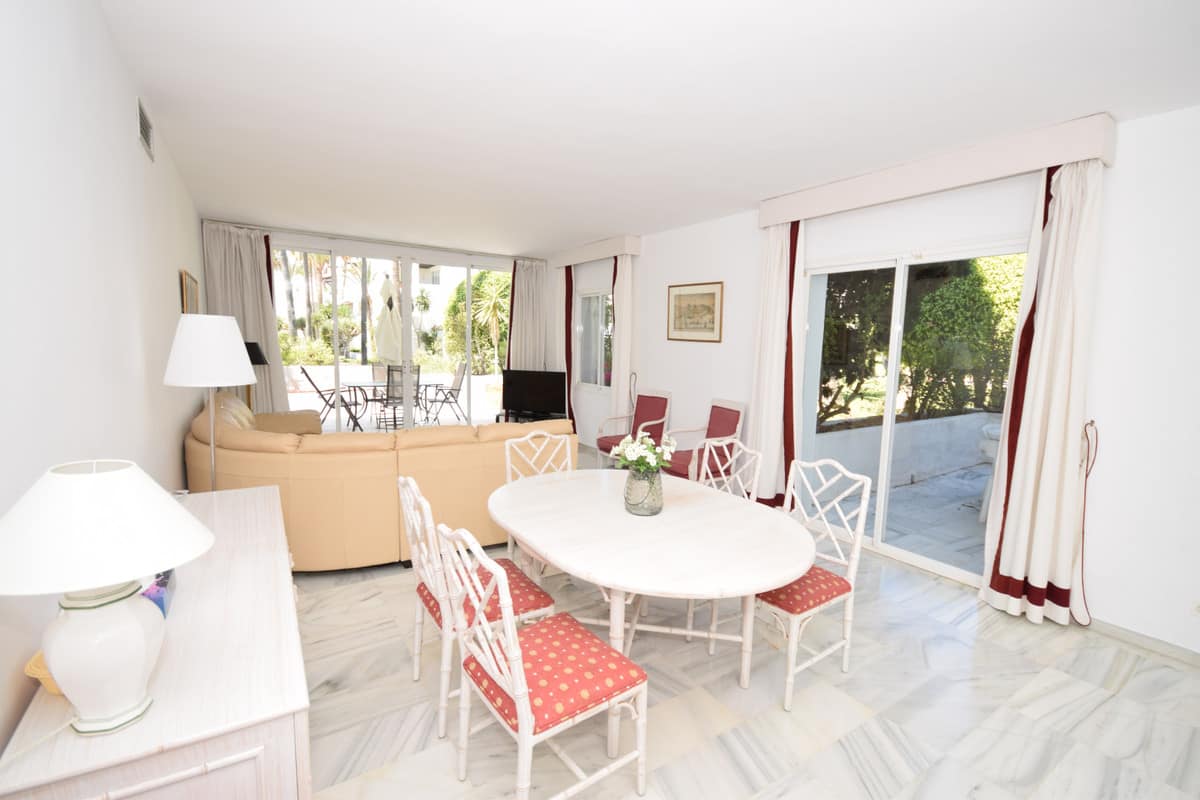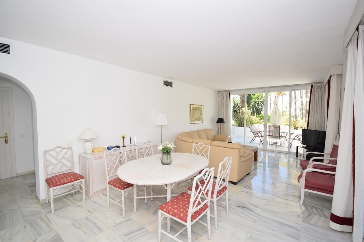 Nice west-facing corner ground floor apartment in Alcazaba Beach, Estepona. The apartment has big terraces with views to the garden and the pool. The apartment consists of 3 bedrooms and 3 bathrooms, dining and living area, kitchen and terraces. This front line beach complex is located in Estepona Alcazaba Beach with installations such as: 7 pools (1 heated), paddle, tennis and basketball courts, a football field, a beach restaurant (open only Easter – October, exclusively open to the guests). It has a beautiful gardens, tennis and paddel courts and children playground. The apartment has marble floors, en-suite bathrooms, a fully-equipped kitchen, air-conditioning and alarm system. Holiday apartment to let – Alcazaba Beach – Estepona – Costa del Sol – Andalusia – Spain