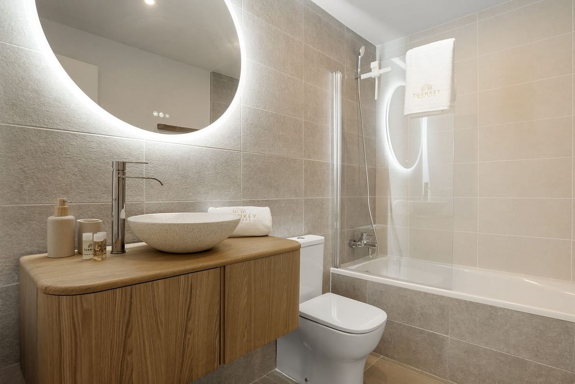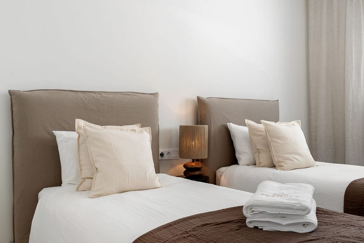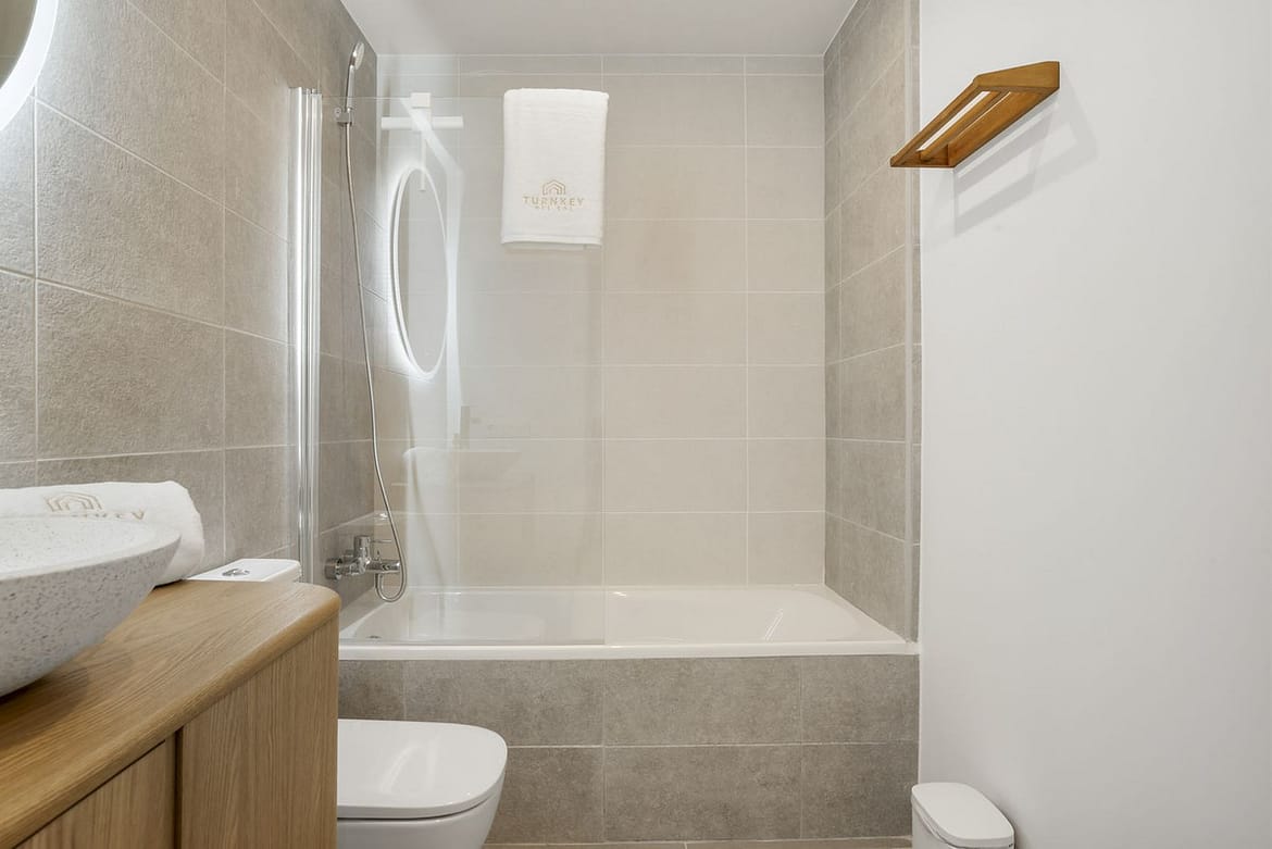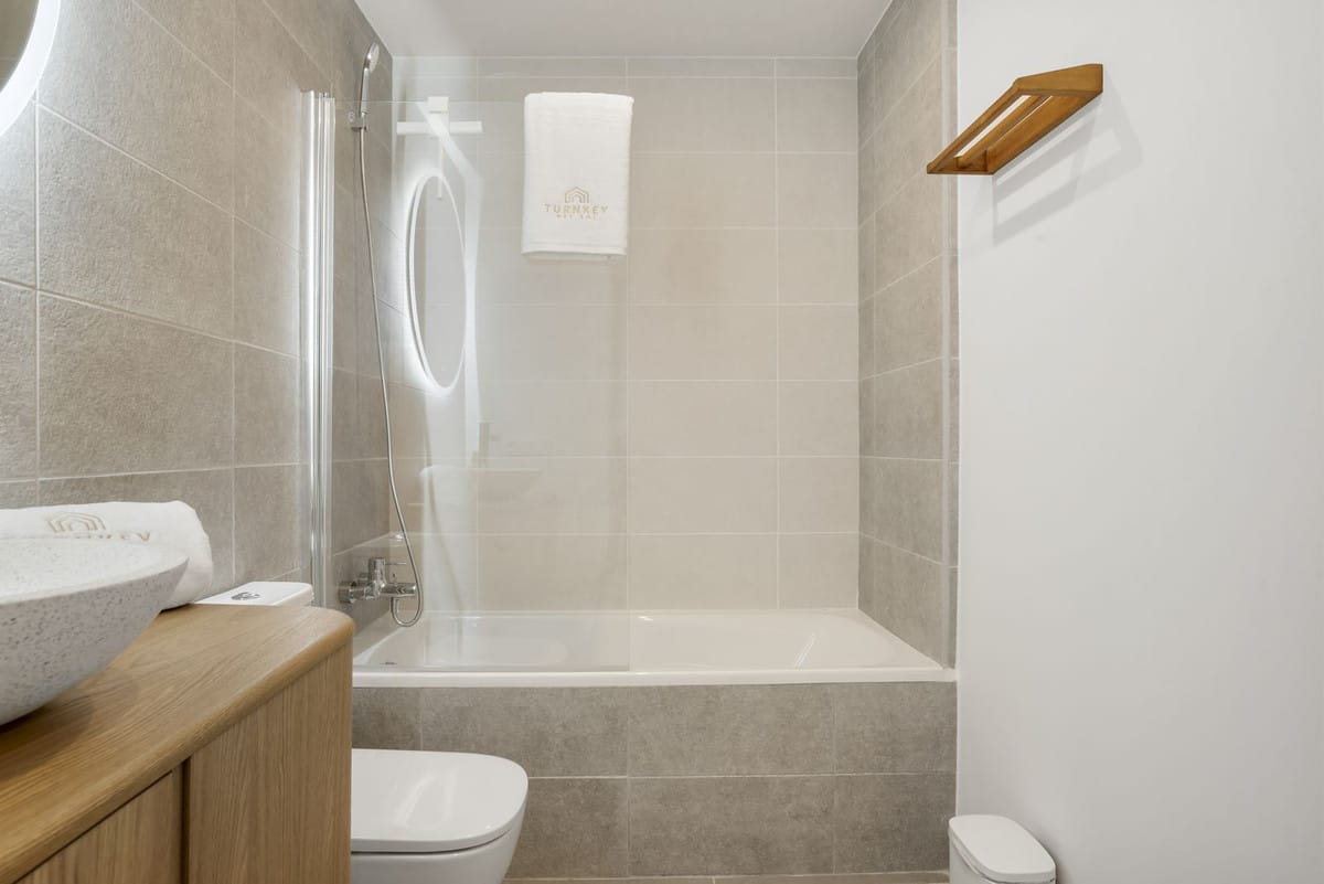 The apartment offers three spacious bedrooms and two full bathrooms. The master bedroom features a double bed and fitted wardrobes. The second bedroom also has a double bed, while the third bedroom is furnished with two single beds — perfect for children or guests.