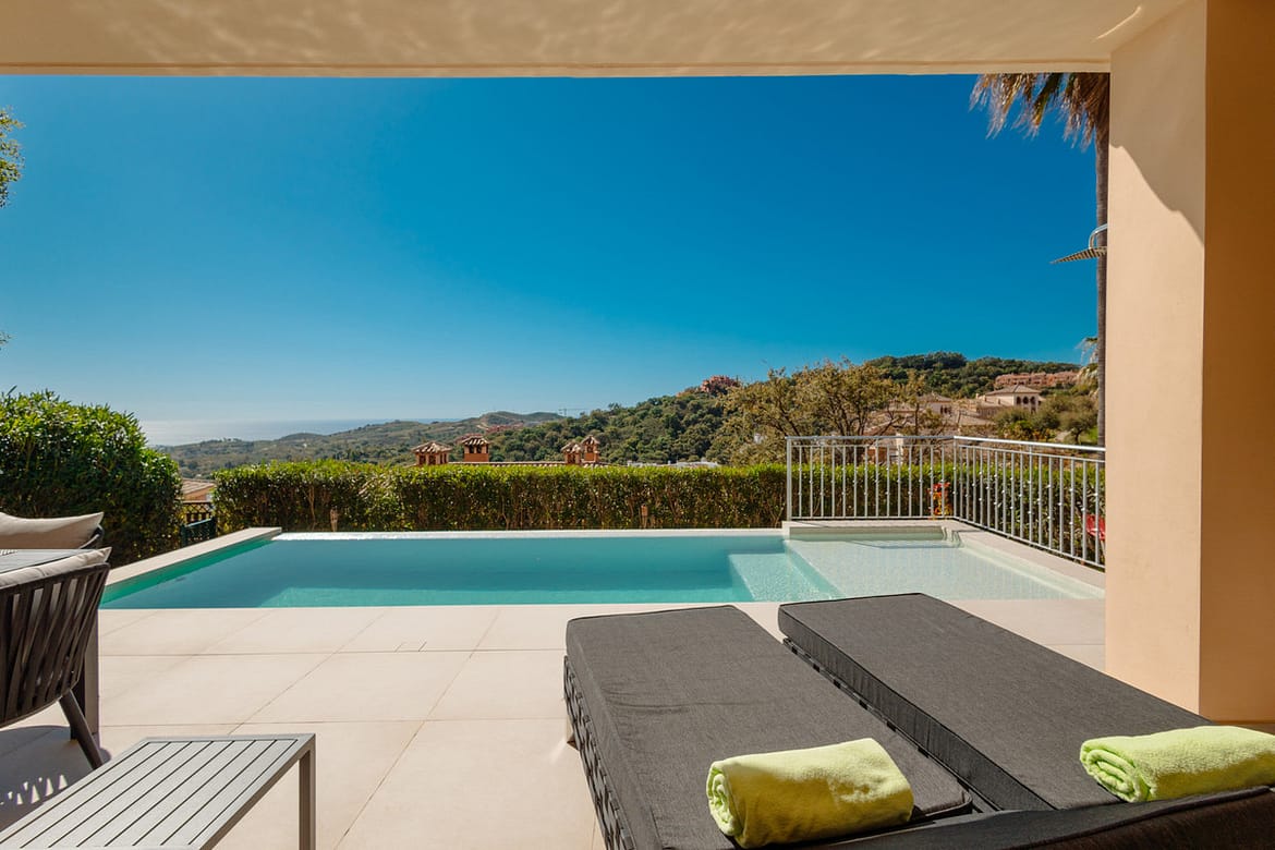 Newly renovated first floor apartment with private pool in La Mairena in Elviria, Marbella. This apartment benefits from exceptional sea views and 3 spacious bedrooms, 3 bathrooms, marble floors and open kitchen.