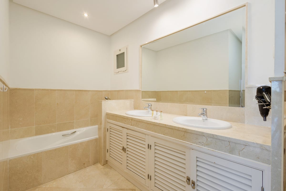 The master bedroom is en suite and has been furnished with a 180×200 Boxspring double bed, it also has a dressing room with safe; the bathroom has a rain shower, bathtub, bidet, toilet and double sinks.