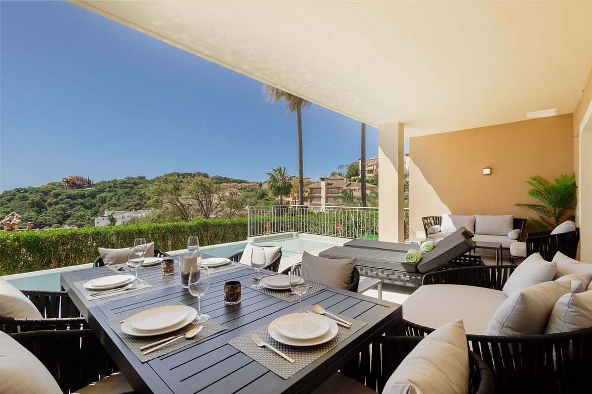 Newly renovated first floor apartment with private pool in La Mairena in Elviria, Marbella. This apartment benefits from exceptional sea views and 3 spacious bedrooms, 3 bathrooms, marble floors and open kitchen.