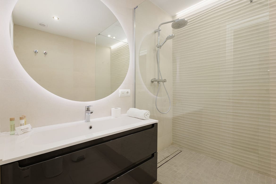 The master bedroom is en suite and has been furnished with a 180×200 Boxspring double bed, it also has a dressing room with safe; the bathroom has a rain shower, bathtub, bidet, toilet and double sinks.
