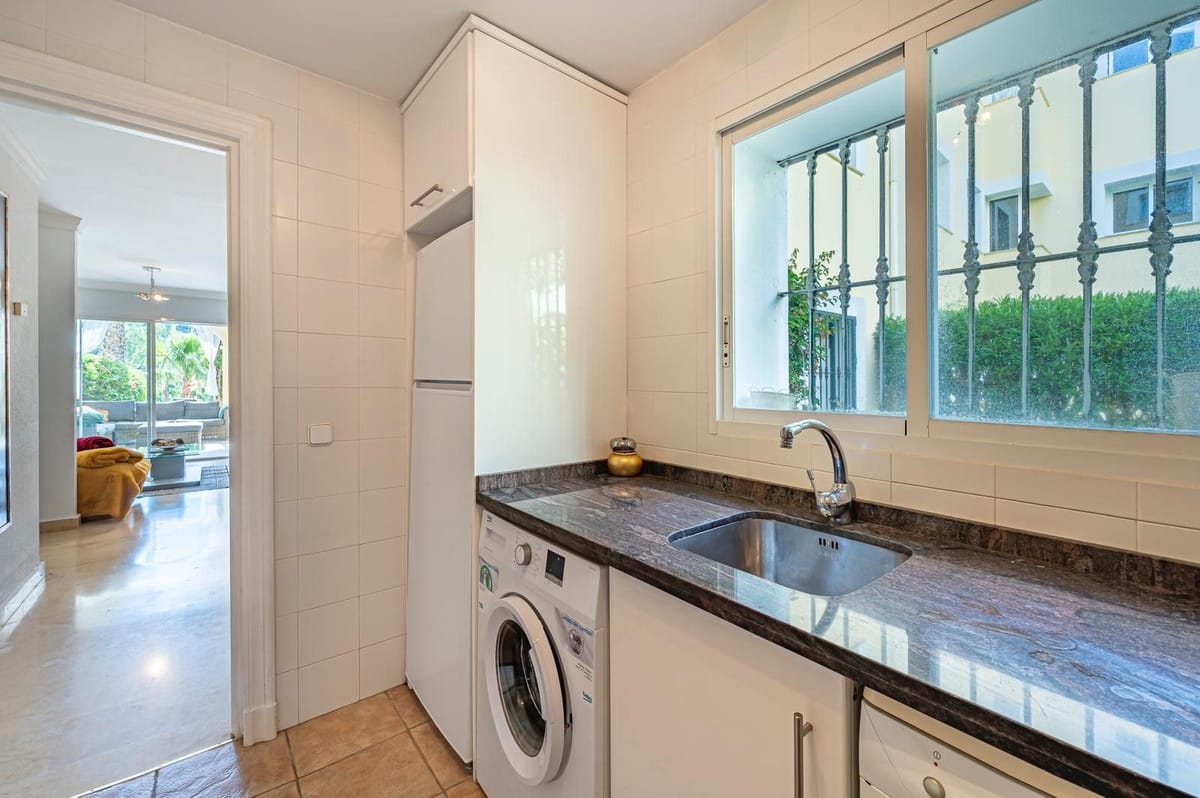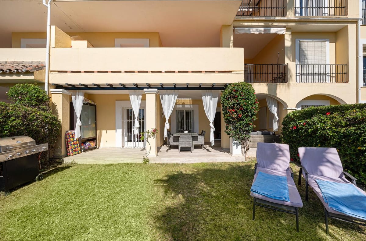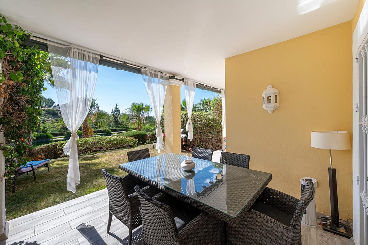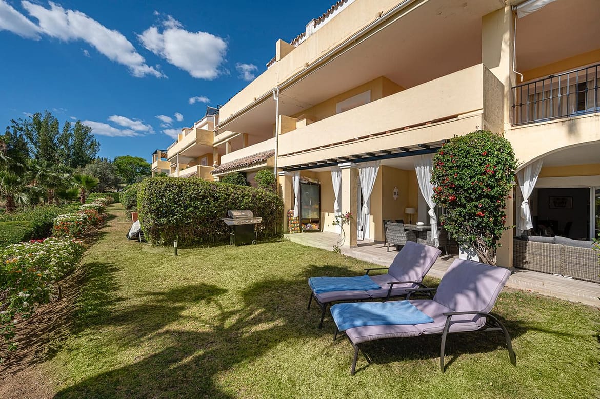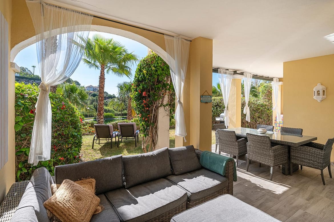 The apartment exudes tranquility and privacy, feeling more like a townhouse than an apartment. The master bedroom includes an en-suite bathroom, while the two guest bedrooms share a second bathroom. The living area opens onto a charming covered terrace, perfect for unwinding with views of the lake, golf course, and landscaped communal gardens. Additionally, an uncovered terrace area is ideal for sunbathing, and from the private garden, you have direct access to the community gardens and two pools.