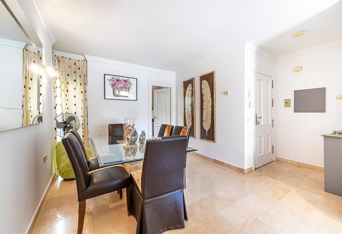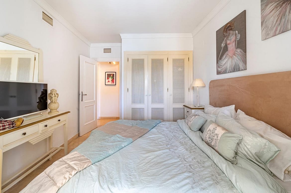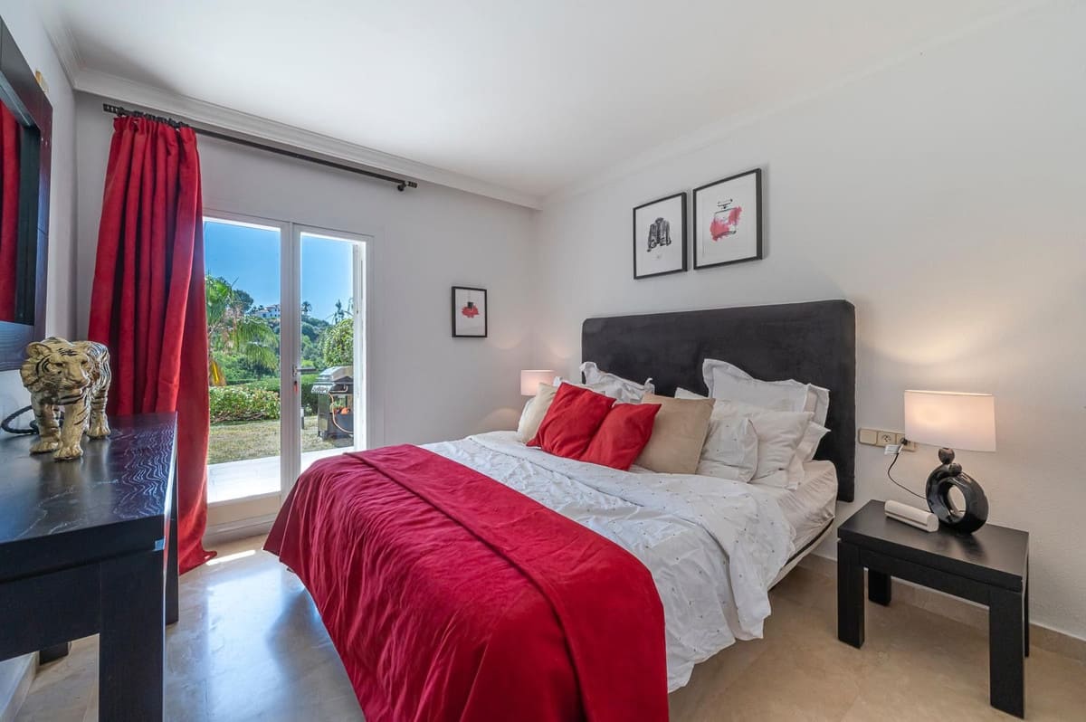This fantastic ground-floor apartment boasts a private garden with serene views of the lake at La Quinta Golf Course, one of the Costa del Sol's most prestigious golf destinations. The property offers three spacious bedrooms with built-in wardrobes and two full bathrooms. The southeast-facing design ensures ample morning sunlight in the living room, terrace, garden, and two bedrooms, with the kitchen and third bedroom receiving afternoon sun.