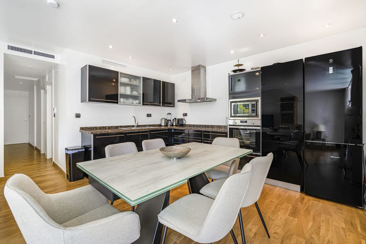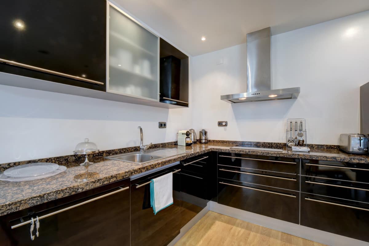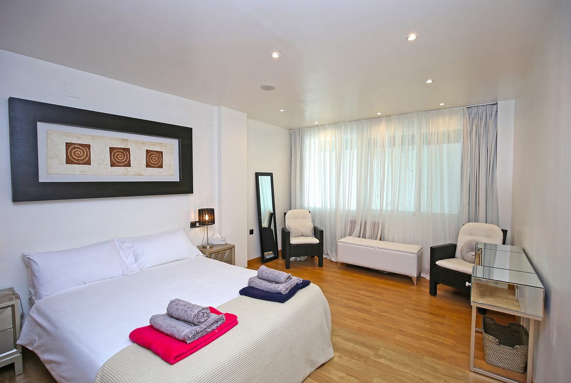 The apartment comprises of a spacious L shaped terrace, one side with a dining area with fridge and freezer, and the other a chill out area with comfy and relaxing sofas and arm chairs and mood lighting. There are even fresh herbs such as mint and coriander which you are welcome to use.