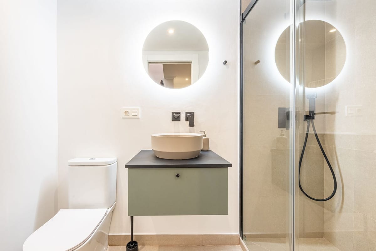 This bright and spacious three bedroom duplex is located within easy walking distance to everything.This is an open and beautiful three bedroom apartment that features a big terrace and combined kitchen and living area. Its distributed over two floors, with spacious master bedroom on the first floor with its double bed, ensuite bathroom, open walk-in wardrobe and back yard terrace. The second bedroom you find one level down with its double bed and en suite bathroom. As well the third bedroom that also have a separate bathroom and another terrace. The kitchen is fully equipped and have dishwasher, toasters, kettle and coffee machine, connected with the kitchen you have the living room with flat screen TV, Wi-Fi, a dining table and access to the terrace. On the terrace you find another dining table and a lounge group.