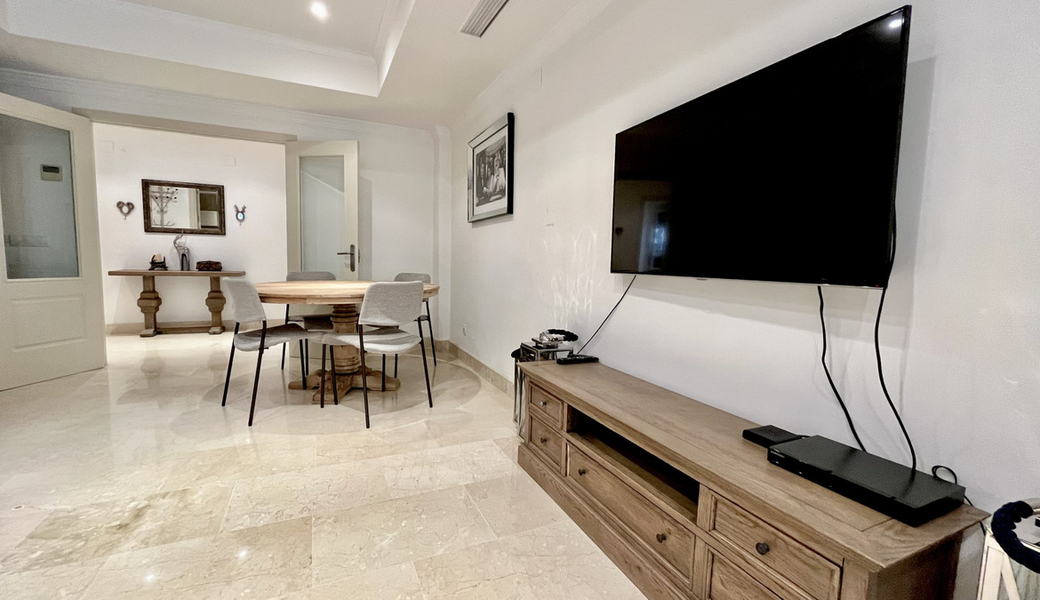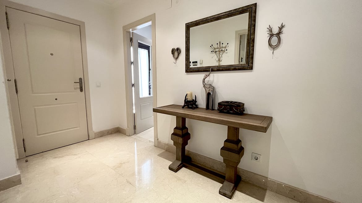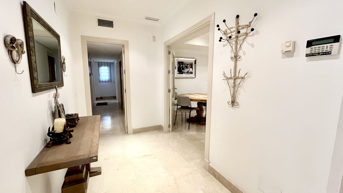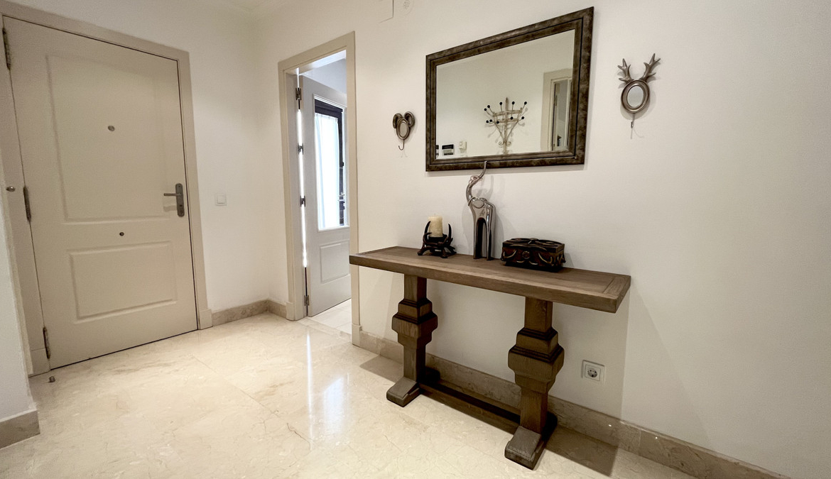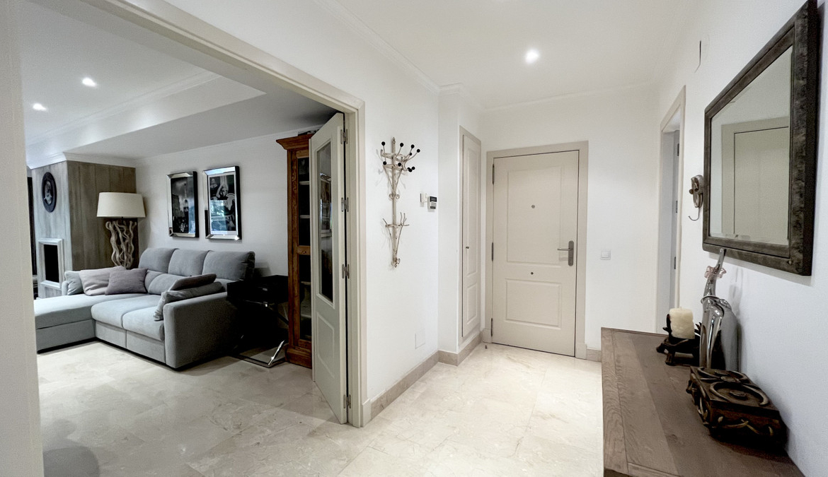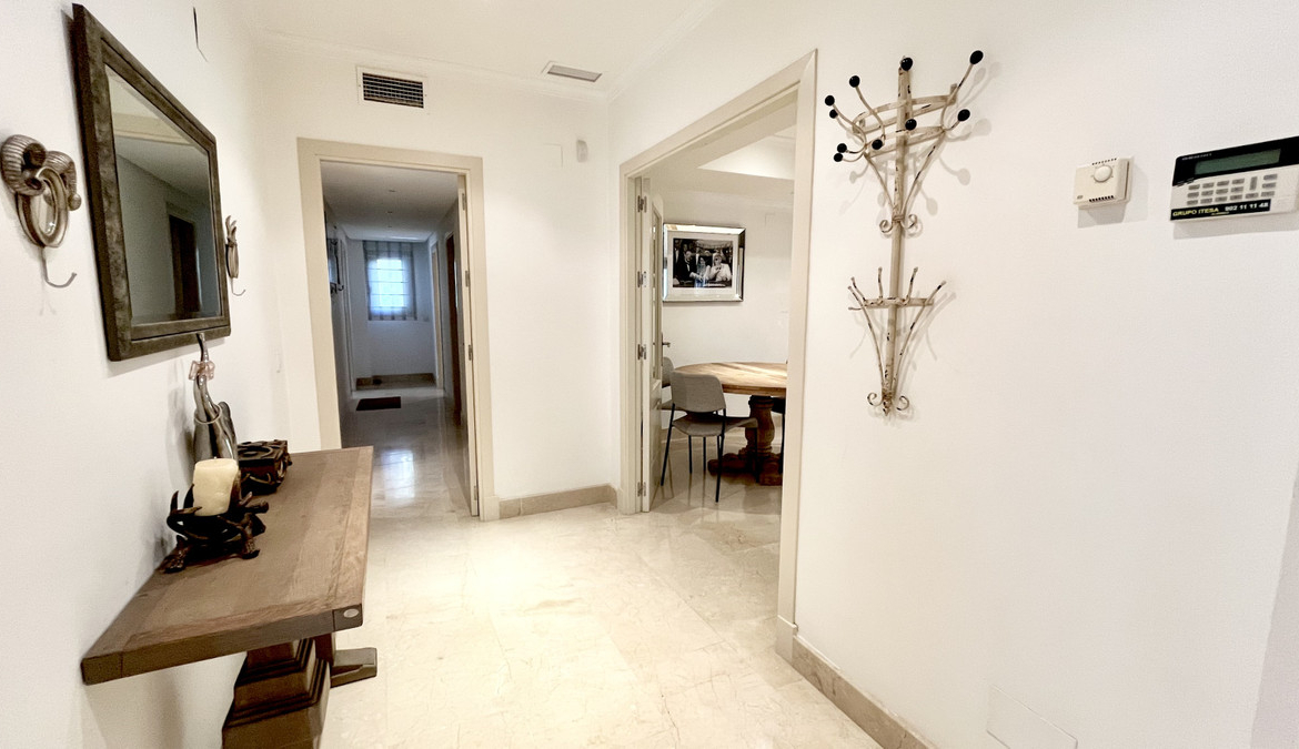 3 bed ground floor apartment in the exclusive, gated community of Lomas del Rey, exceptional high-quality construction melded with extraordinary attention to detail yield this contemporary apartment. Its expansive spaces, open concept floorplan and walls of glass create a breathtaking experience of spaciousness and light. On entering the home through the hallway, to the right, there is a large living/dining room and kitchen which open onto the expansive terrace. Straight ahead there is a corridor with guest toilet and guest suite with a walk-in closet. To the left is the sizeable master suite, also with walk-in closet and a private terrace.