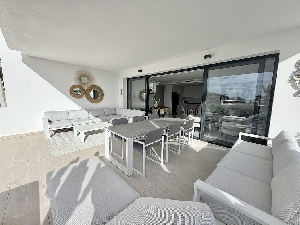 Exclusive south-facing ground floor apartment with villa allure, located on Atalaya Golf (36 holes). Spacious terrace and private garden with open views of the golf course and the sea; the driving range is right on the doorstep in a quiet, green area.