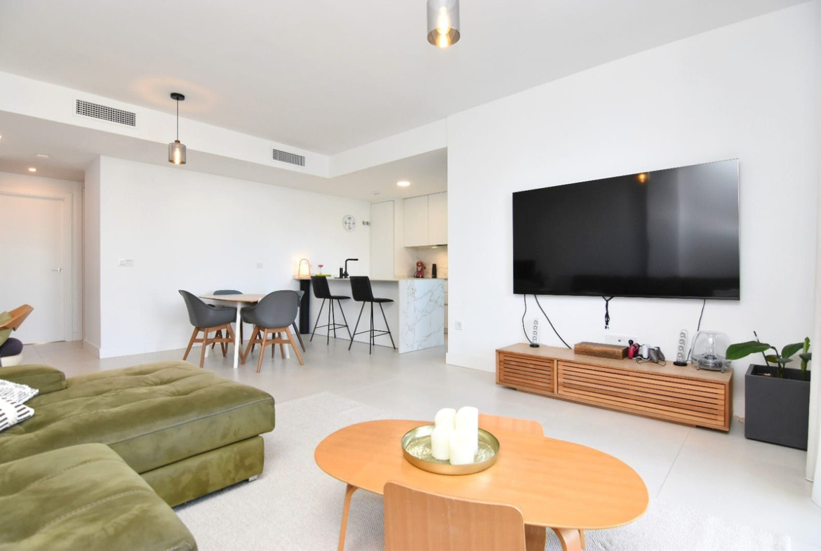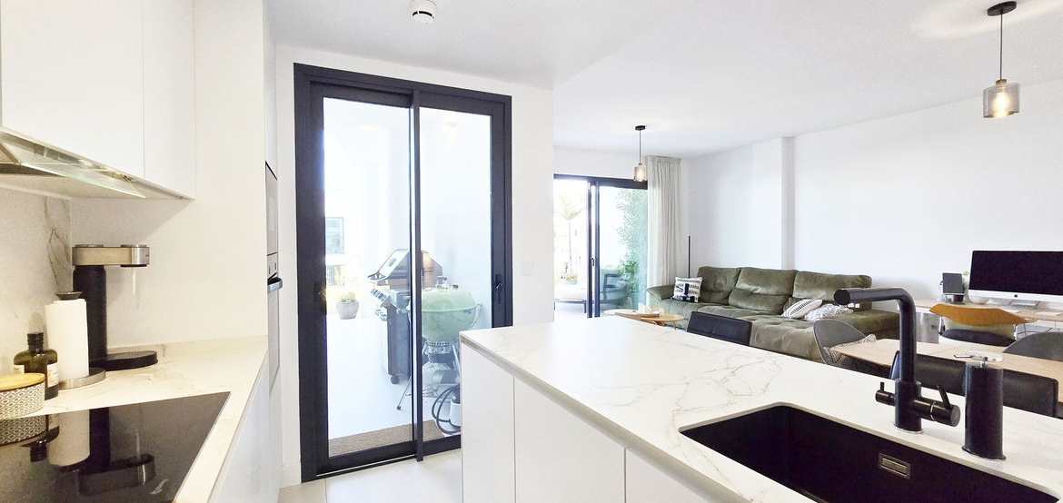 The bright living room with open-plan kitchen connects to the terrace and barbecue area – ideal for enjoying the Mediterranean climate all year round. The kitchen also features a large window with direct access to the terrace, bringing in plenty of natural light.