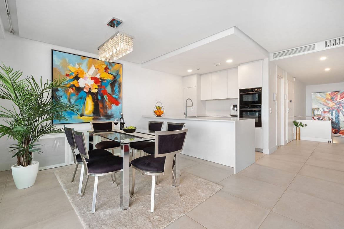 It is south-facing and is a corner of the building. The glazed terrace is like a second living room, with open views of the large communal pool, the well-maintained buildings, full of garden boxes with plants and flowers; a little bit of a sea view is also appreciated.