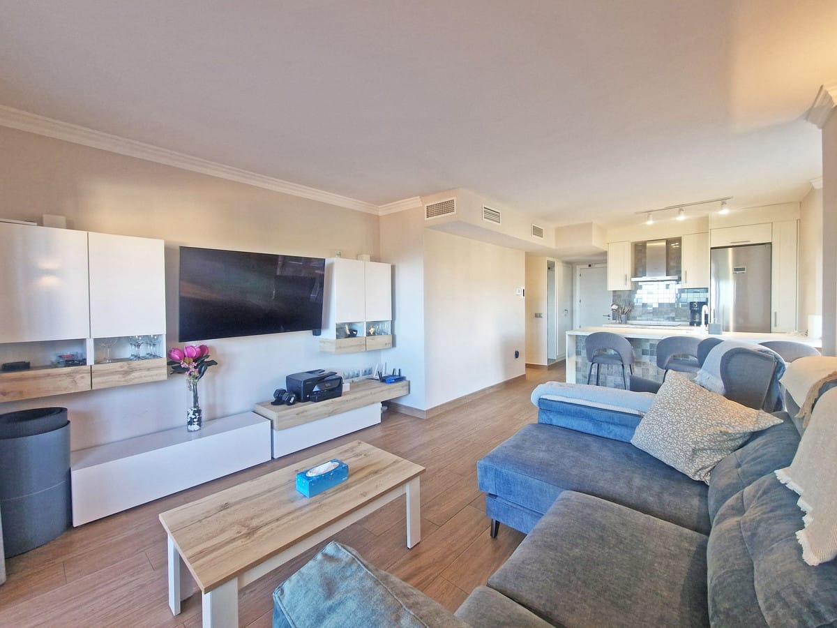 Located on an elevated corner ground floor, the apartment offers easy, step-free access directly from the communal parking area. The open-plan American-style kitchen comes fully fitted with BOSCH appliances and flows into a bright and spacious living room. Large glass curtains on the main terrace capture abundant natural light and frame beautiful sea views, complemented by additional side windows.