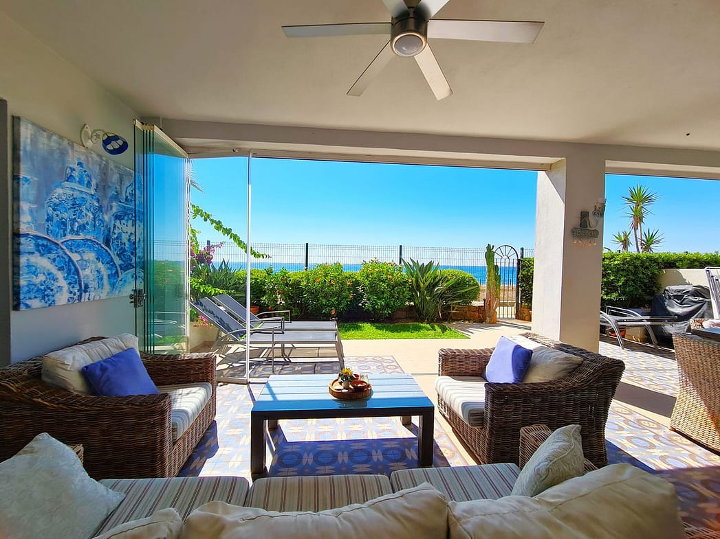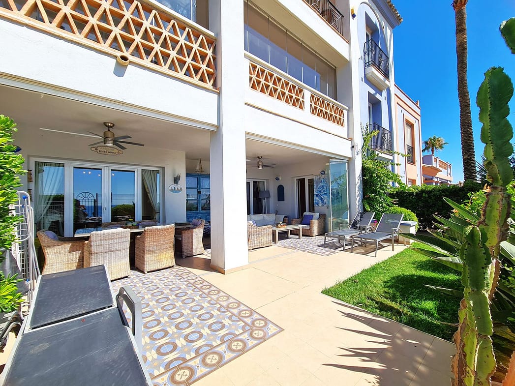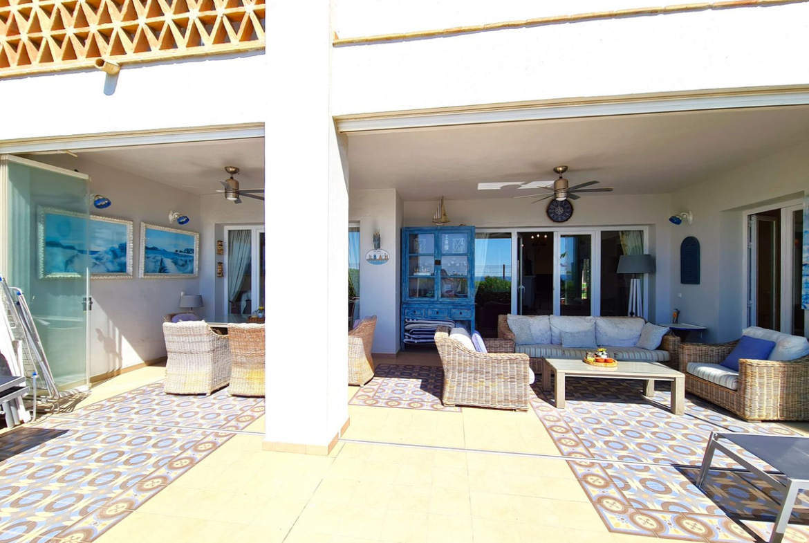 Enjoying an excellent beachfront location with direct access to the coastal path and Casares Beach, just minutes from the Finca Cortesín Golf Course, one of the most prestigious golf courses in Spain, which has hosted numerous high-profile events, including the Volvo World Match Play Championship three times and the 2023 Solheim Cup. Just a 10-minute drive from Estepona and 4 minutes from San Luis de Sabinillas with its beautiful and picturesque Puerto de La Duquesa. Close to supermarkets, schools, and the new Estepona Hospital. This LARGE GROUND FLOOR APARTMENT WITH PRIVATE GARDEN AND SEA VIEWS has DIRECT ACCESS TO THE BEACH and is SOUTH FACING. The property boasts a spacious entrance hall leading to the spacious living-dining room with large windows that connect to the large covered terrace, which is enclosed by glass curtains and provides abundant natural light and beautiful views of the sea and the garden from inside the house. The open-plan kitchen is fully equipped and has a laundry room. These common areas have a guest toilet located next to the entrance of the house. The three bedrooms of the home are distributed from the living room area. The two guest bedrooms have large built-in wardrobes and large windows overlooking the beautiful communal gardens. Adjacent to them is a full bathroom with a bathtub and underfloor heating. The spacious master bedroom has a dressing area and an en-suite bathroom with a whirlpool bathtub, separate shower, double sinks, and underfloor heating. This bedroom also has direct access to the private terrace. The home enjoys beautiful and well-maintained common areas with several swimming pools and ideal gardens. GREAT OPPORTUNITY TO EXPERIENCE THE LUXURY OF HAVING YOUR HOME ON THE SHORES OF THE MEDITERRANEAN SEA!!