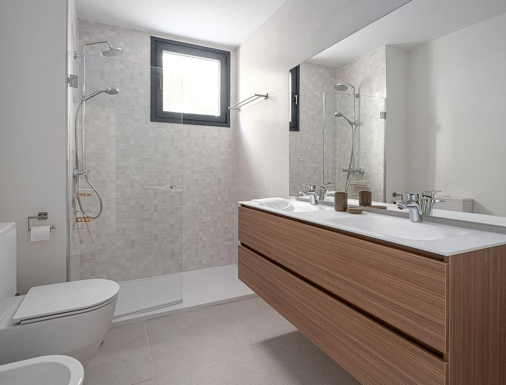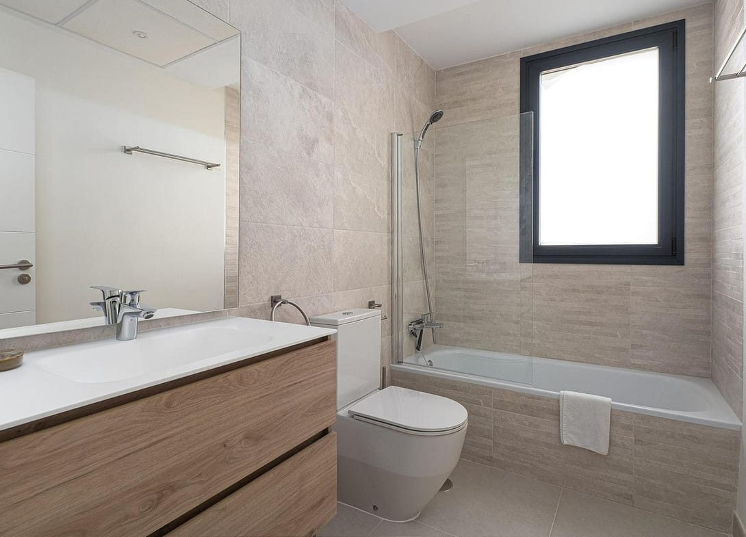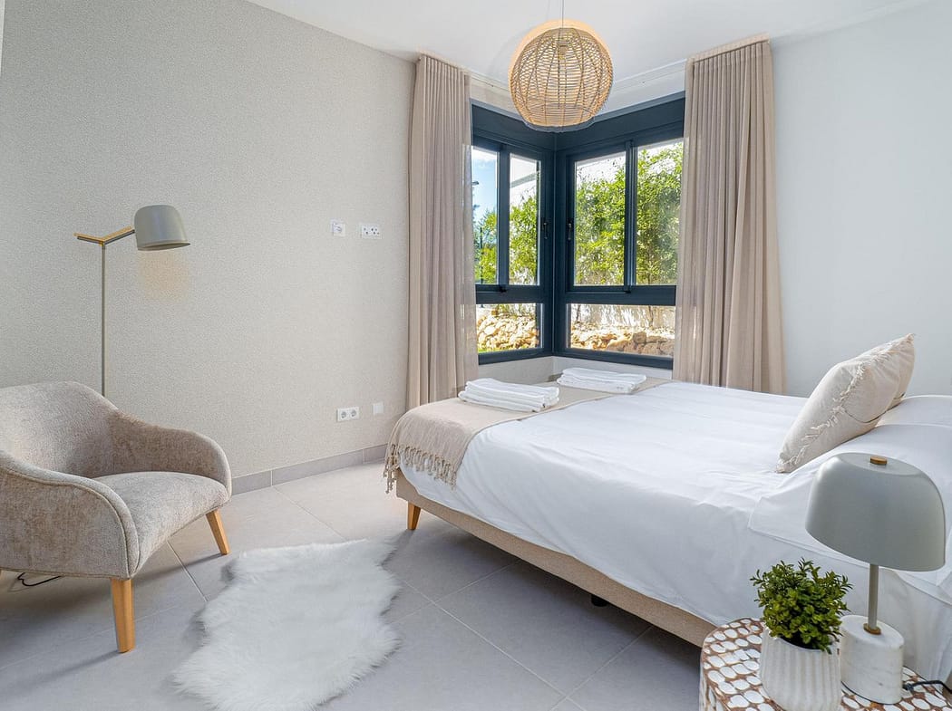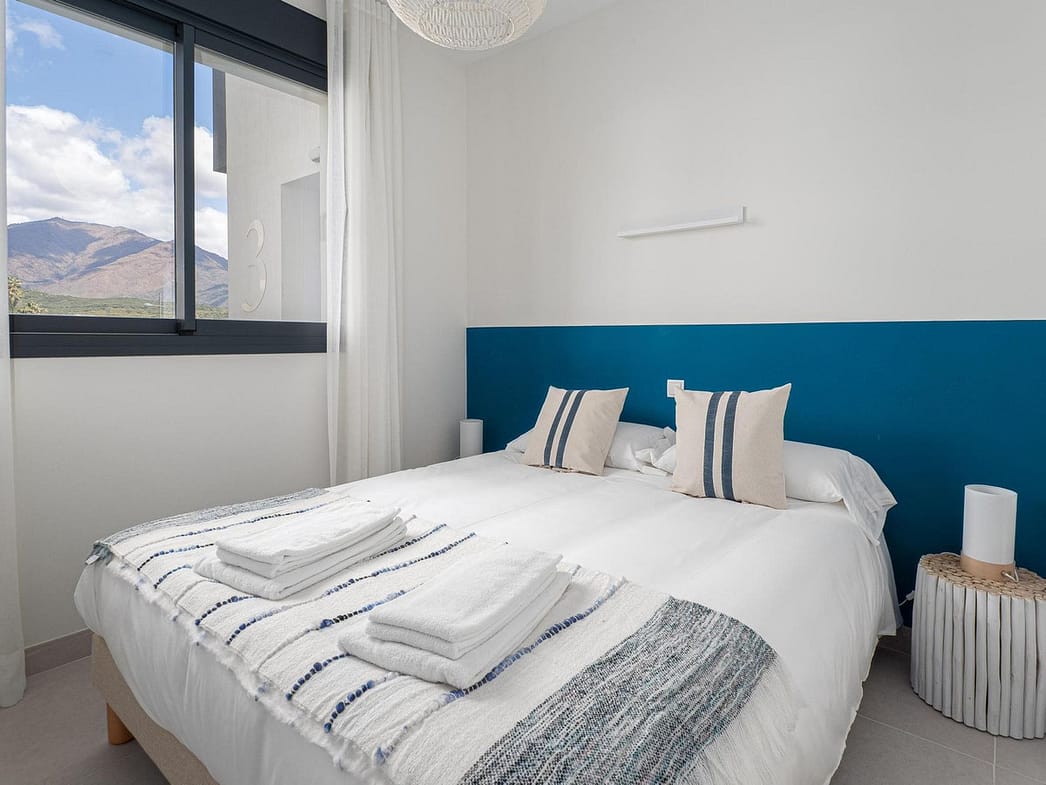 The master bedroom comes with a private ensuite bathroom with walk-in shower and built-in wardrobes, and offers direct views of the terrace and garden. The two additional bedrooms, both with fitted wardrobes and beautiful views of the Sierra Bermeja mountains and pool, share a stylish second bathroom with bathtub. A separate utility room next to the kitchen houses the washing machine and provides additional storage space.