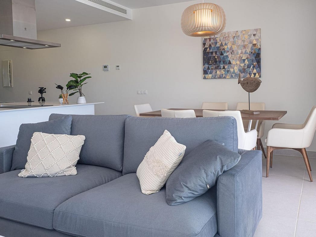 Inside, the apartment is tastefully decorated and fully furnished, featuring high-quality finishes throughout. The open-plan kitchen with a striking central island is fitted with top-quality Siemens A+ appliances. The bright and airy living and dining area flows seamlessly to the terrace and garden through three large sliding doors – blending indoor and outdoor living in true Mediterranean style.