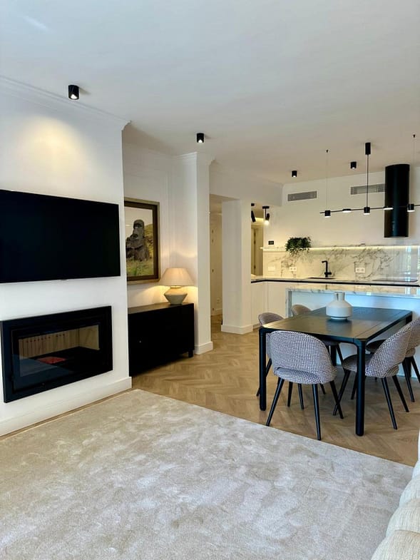 The apartment has been recently renovated and is decorated in a modern style using high-quality materials and stylish design solutions.