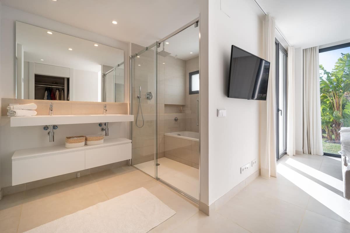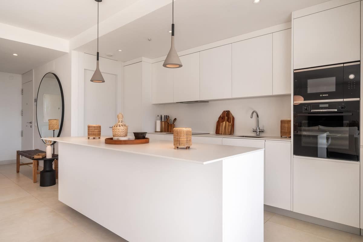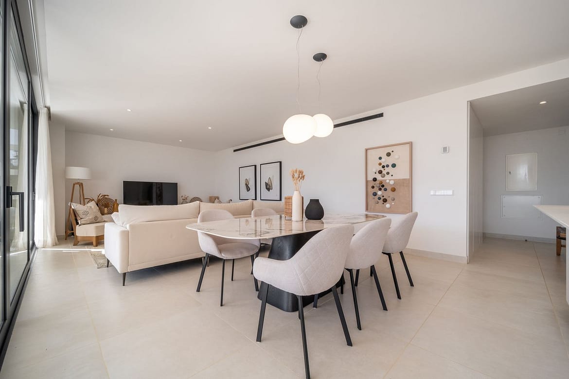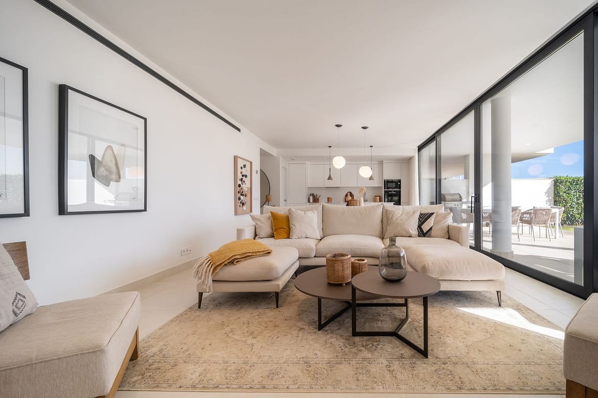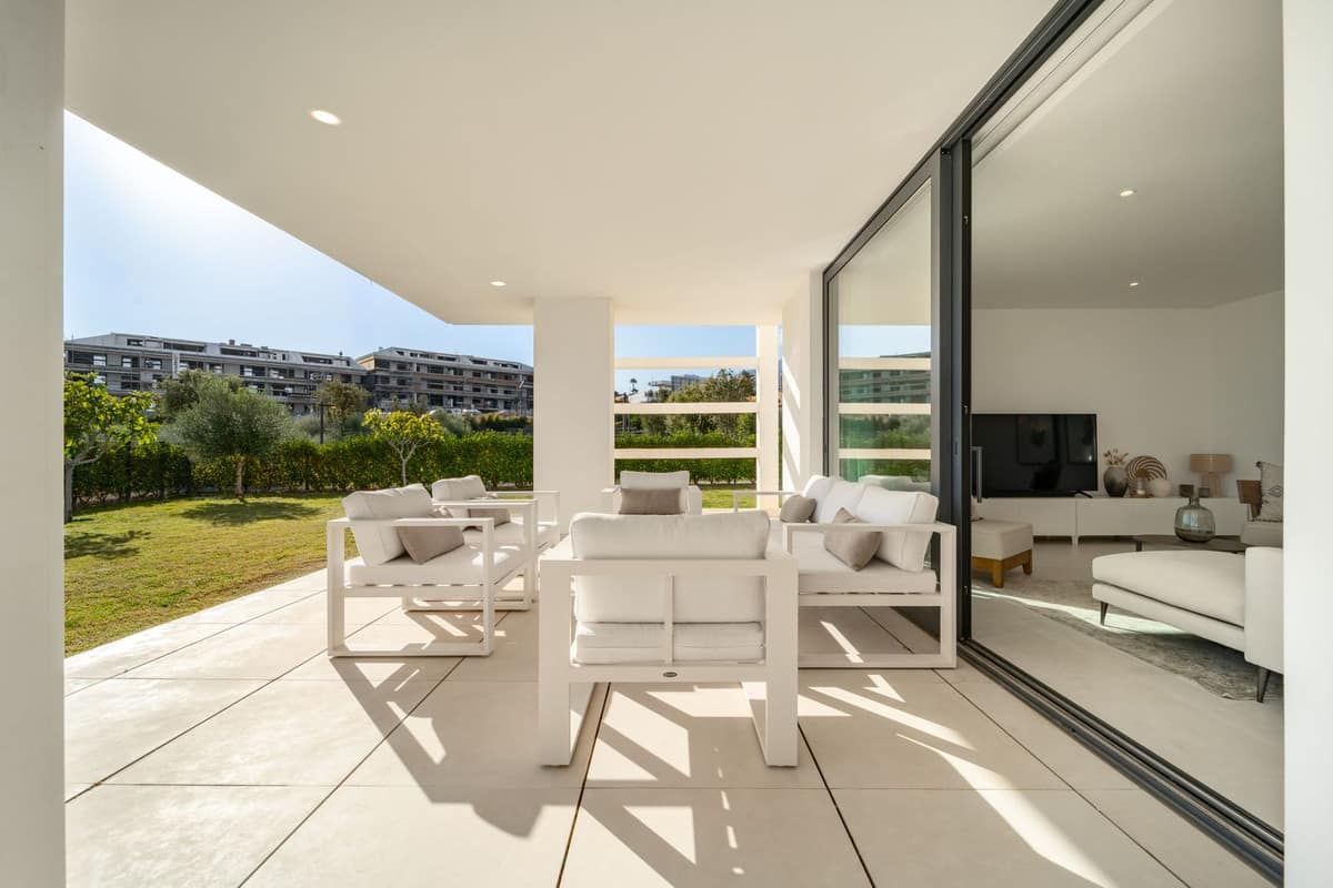 Stunning west facing corner garden apartment, with 3 bedrooms, and 2 bathrooms, spacious living-dining room, open plan kitchen fully furnished and equipped with electricial appliances from Bosch, including MIELE fridge/freezer, laundry area with washing machine/dryer, large wrap around terrace of 78m2 with access from living area and main bedroom. There is also a backside terrace of 34m2 with access from the secondary bedrooms. Spacious private garden area of 258m2. Main bedroom with ensuite bathroom and walk-in wardrobe. Air conditioning hot and cold, built-in wardrobes in secondary bedrooms and hall entrance, video intercom, domotic system, pre-installation alarm system, water purification system in kitchen, under floor heating throughout all the apartment including bathrooms. Includes two parking spaces (one parking with electric car charger) and one storage room.