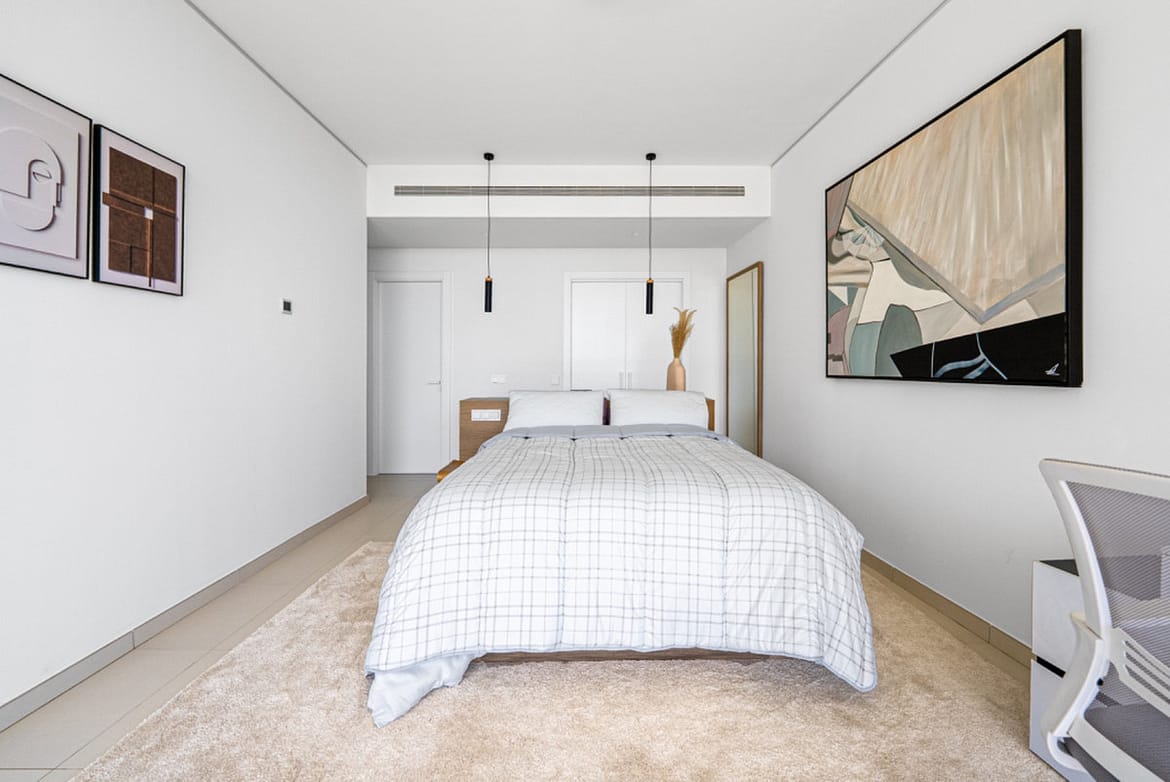 The spacious layout flows from the kitchen to the dining and lounge areas, each with direct access to the 16-metre terrace. All three bedrooms open onto this sun-drenched space, each fitted with built-in wardrobes and designed for calm and comfort. Two contemporary bathrooms include dual sinks, wood accents, and large walk-in showers that complete the home’s refined style.