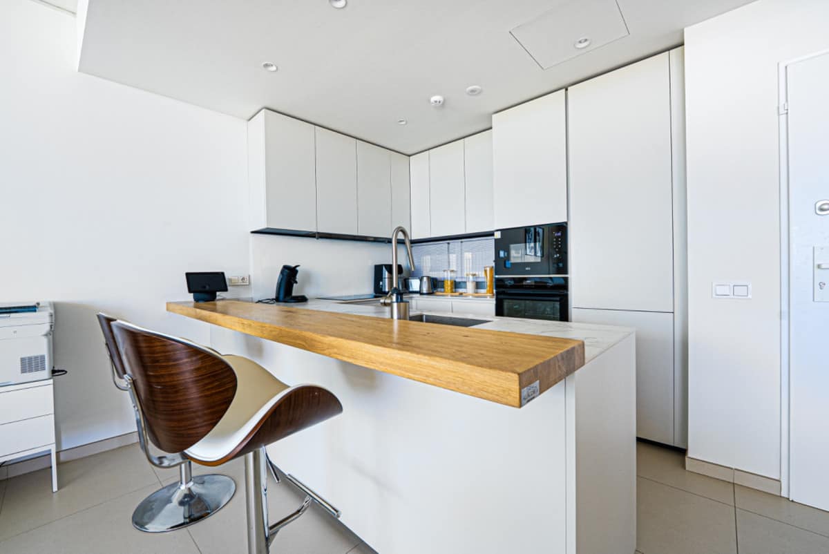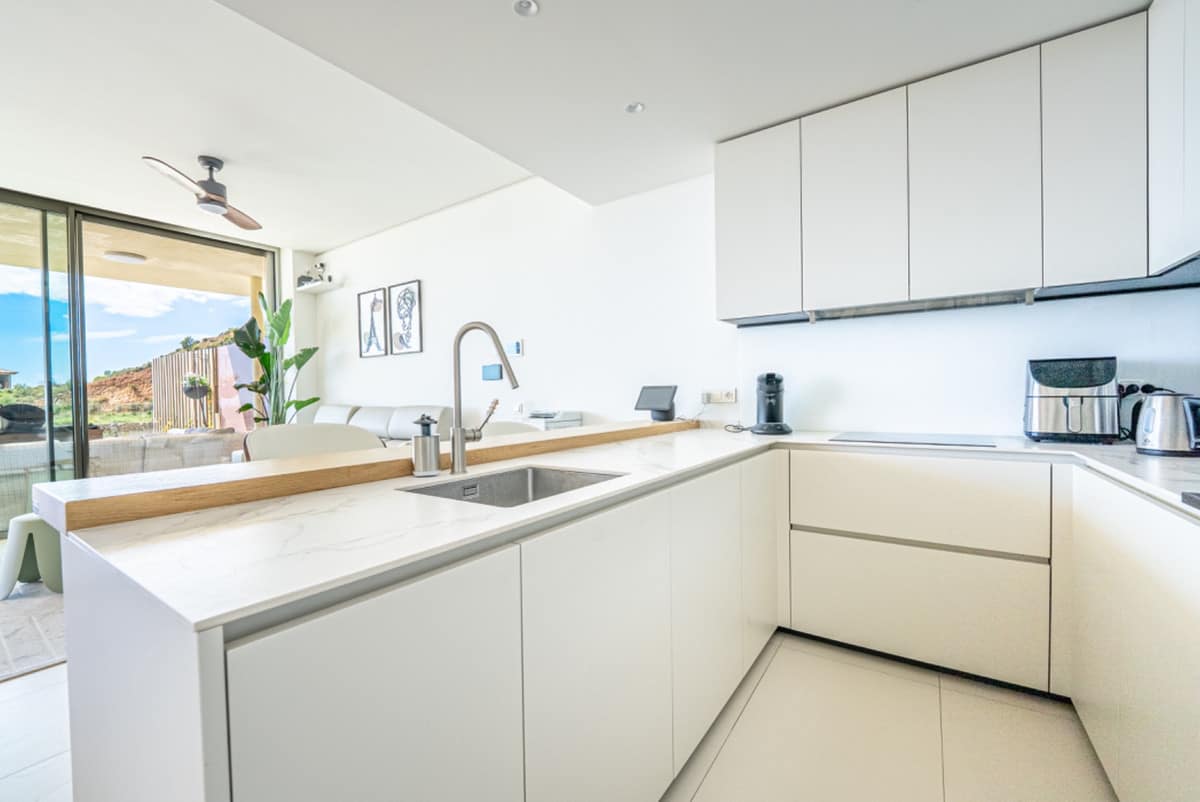 Apartment West is a ground-floor luxury home with uninterrupted sea views that stretch across the horizon. The open-plan living area is filled with natural light through floor-to-ceiling terrace doors. The kitchen features marble countertops, sleek neutral cabinetry, and stainless-steel appliances, offering a modern and elegant finish.