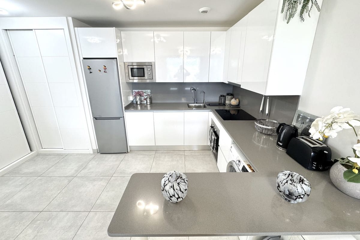 This modern luxury apartment offers; spacious lounge/ dining area with large open plan modern white high-gloss fitted kitchen. With fitted oven, hob, hood, fridge freezer, microwave. 3 large double bedrooms with fitted wardrobes, Master with patio doors to terrace, walk in wardrobe & luxury en-suite shower room. Plus a 2nd family shower room. Covered terrace (now with glass curtains) and private use garden offering views over development with mountain backdrop and partial sea views. Hot & cold air-con, private parking space and storage room. Interiors have a beautiful timeless design, with high quality finishes and feature neutral colour palettes.