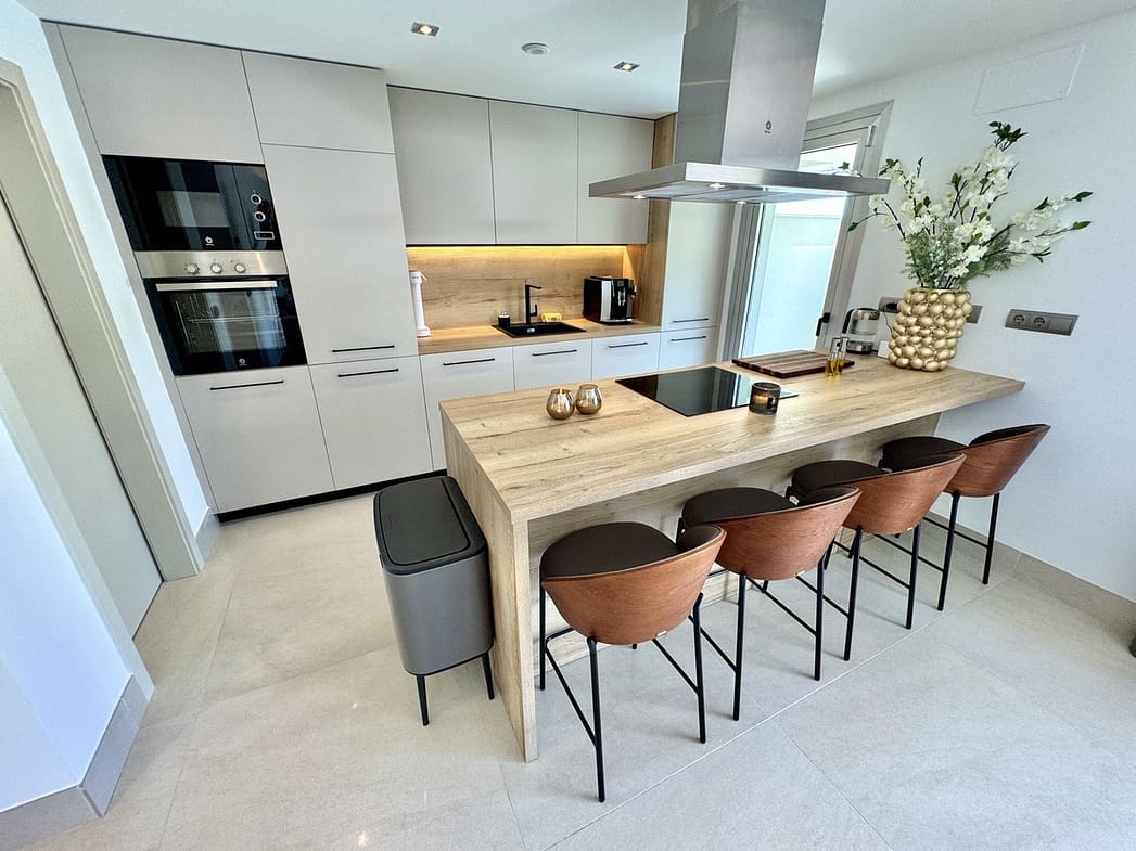 This modern corner garden apartment for sale offers near idilic modern luxury living and gives the feeling of living in a new build one level villa. High quality build with modern open plan layout and beautifully decorated throughout. Entrance hall with luxury wallpaper and wood panelling in parts, leading onto main living area and all bedrooms and bathrooms.