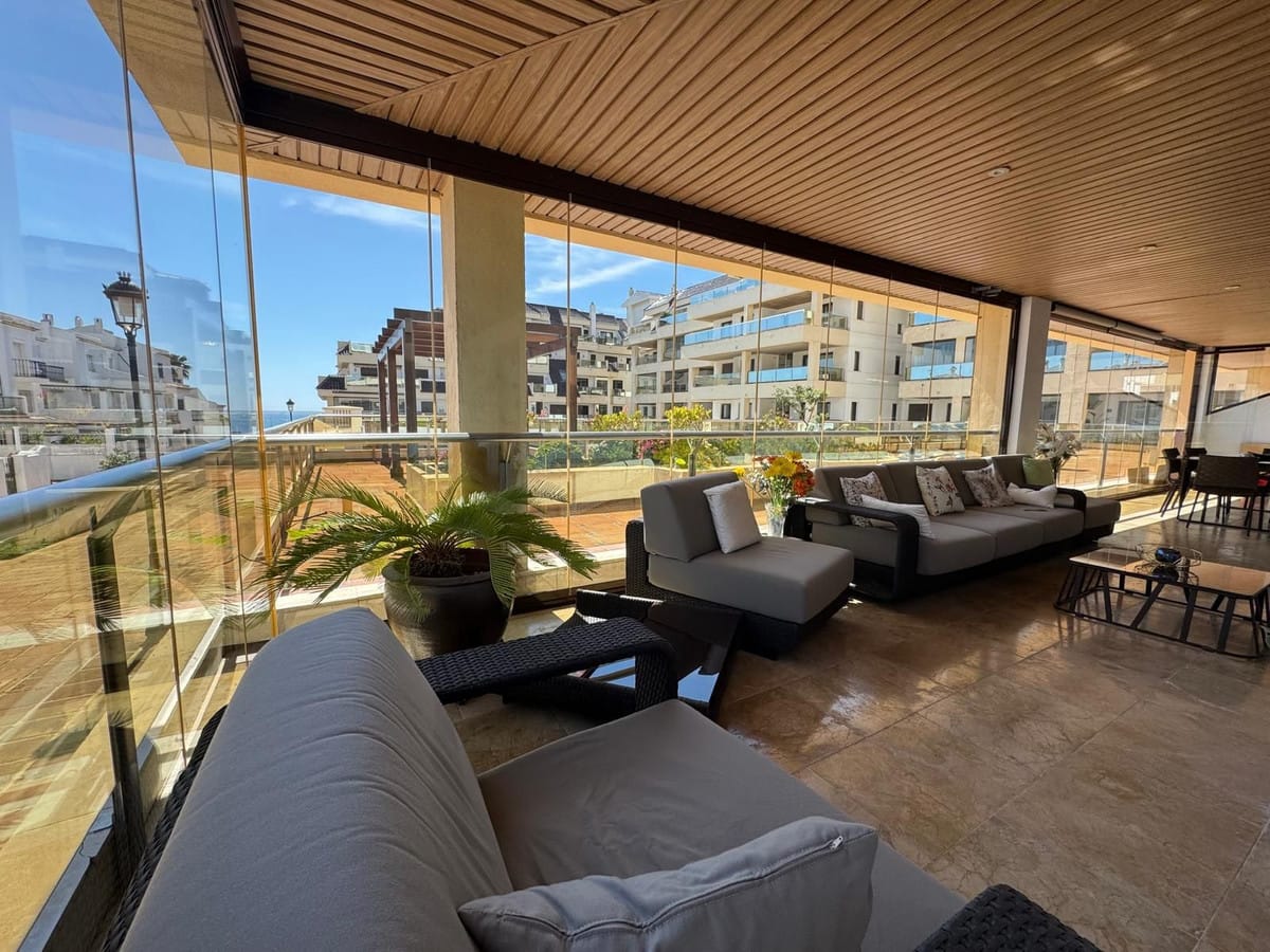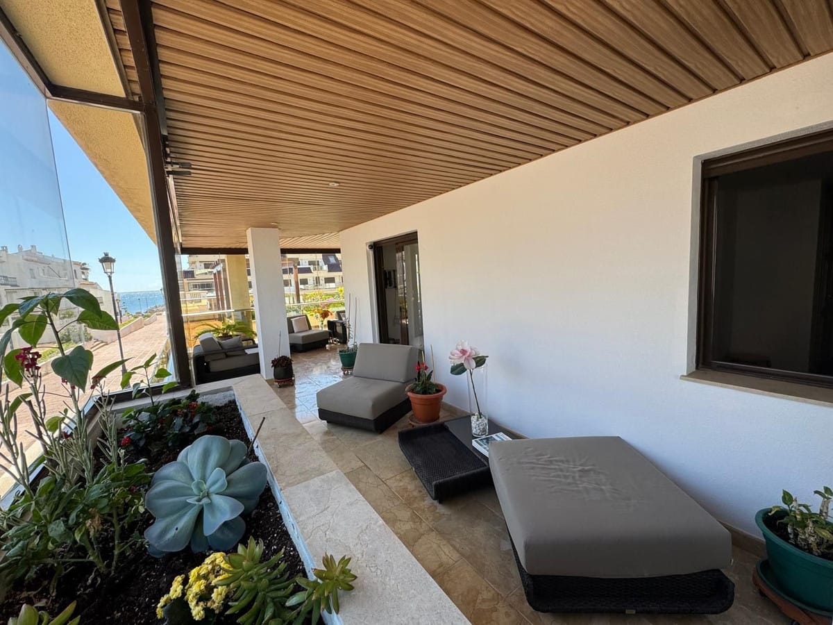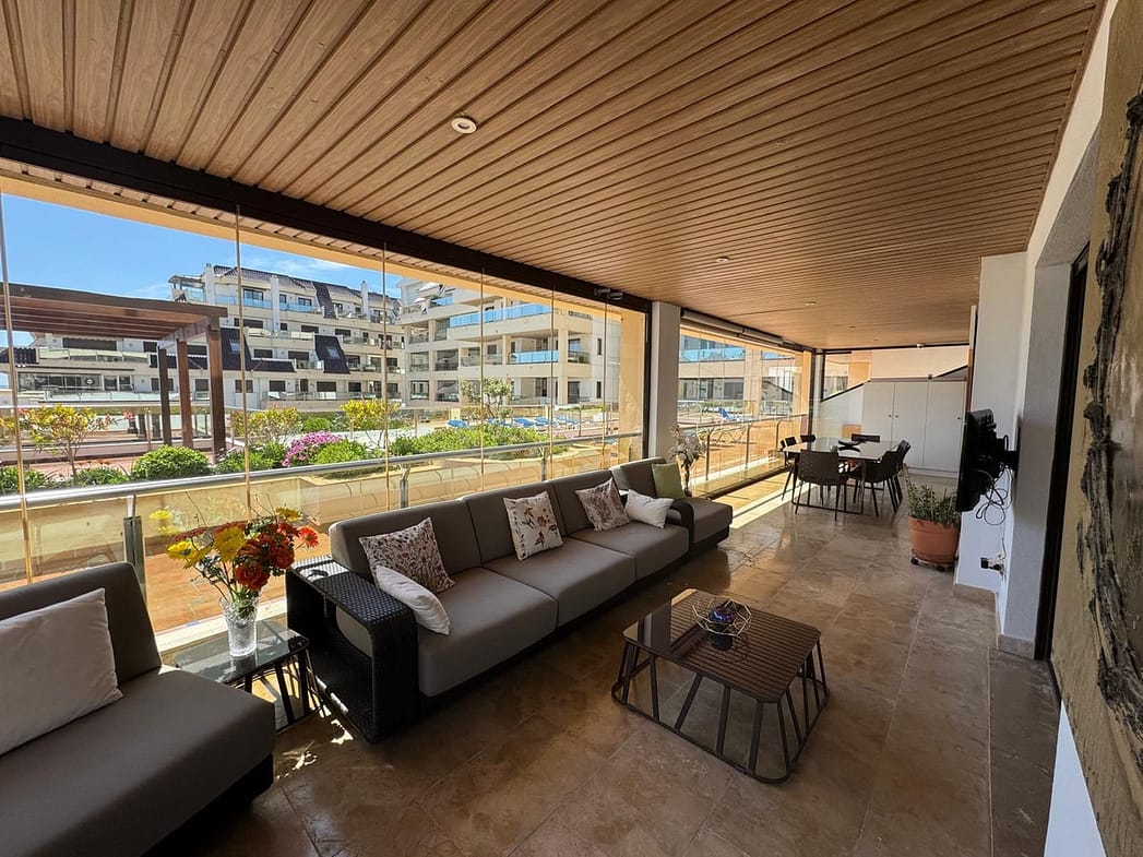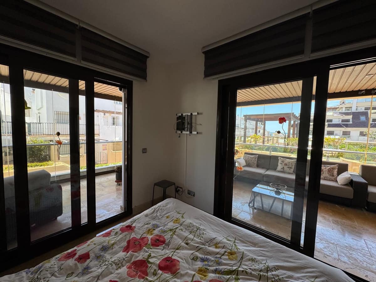 Magnificent 3 bedroom ground floor flat in the beautiful urbanisation of Marina Castillo, on the beachfront. A very nice flat, good qualities, with air conditioning hot/cold and home automation. The kitchen is independent with a small laundry room, we have 3 bedrooms with electric blinds and 2 complete bathrooms with electric towel rails, one en suite. The living-dining room, as well as the kitchen and 2 bedrooms have access to the large terrace of almost 70m2. The terrace is closed with glass curtains that allow you to enjoy your stay all day long and its corner location lets the sun in the morning until 13h but recovers it in the afternoon, a real pleasure. A quiet location, close to a rest area and with easy access to the communal swimming pool. The views are nice, some sea, garden and small Andalusian villaje complex….