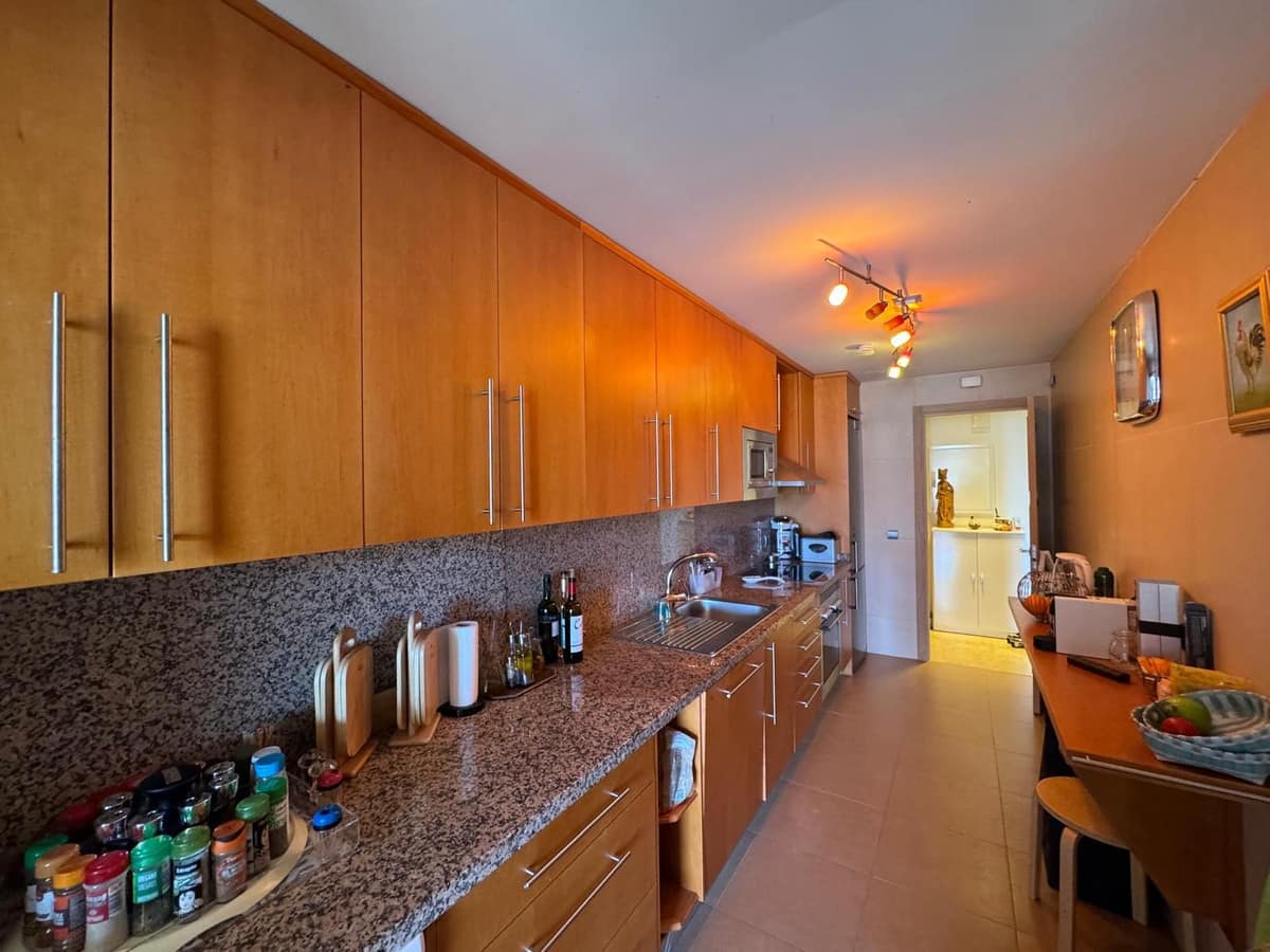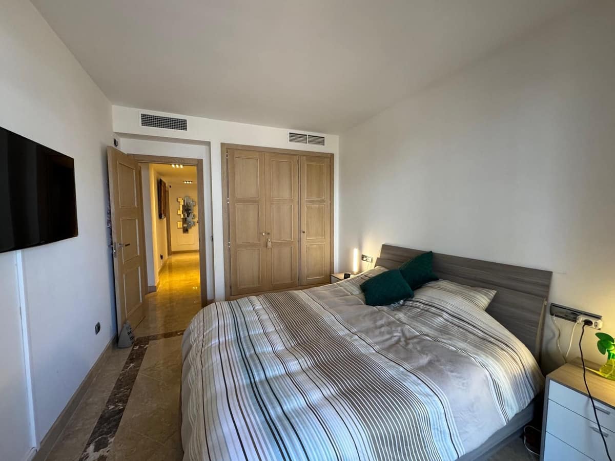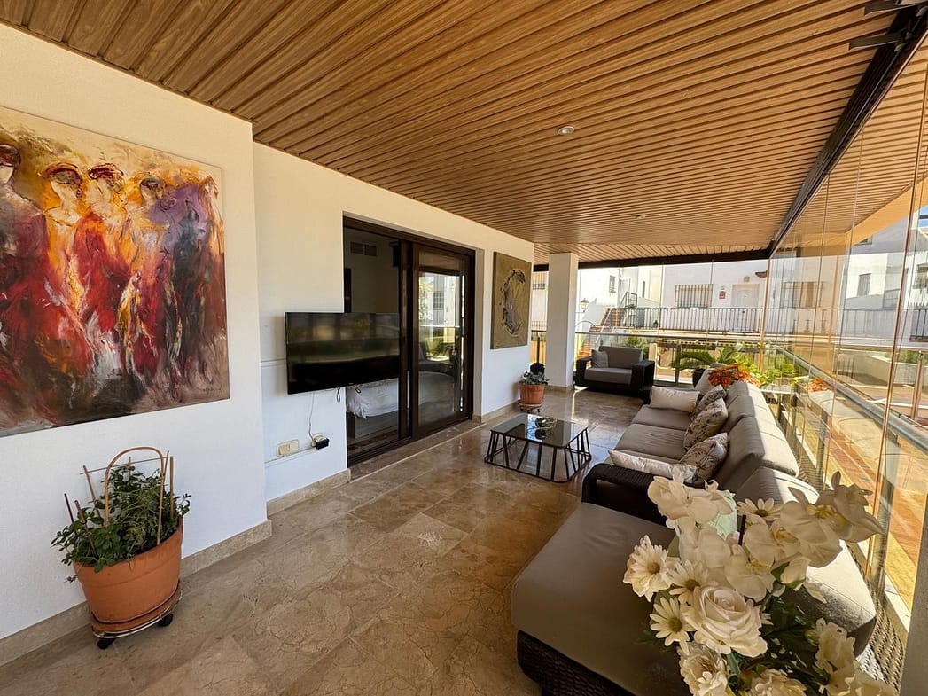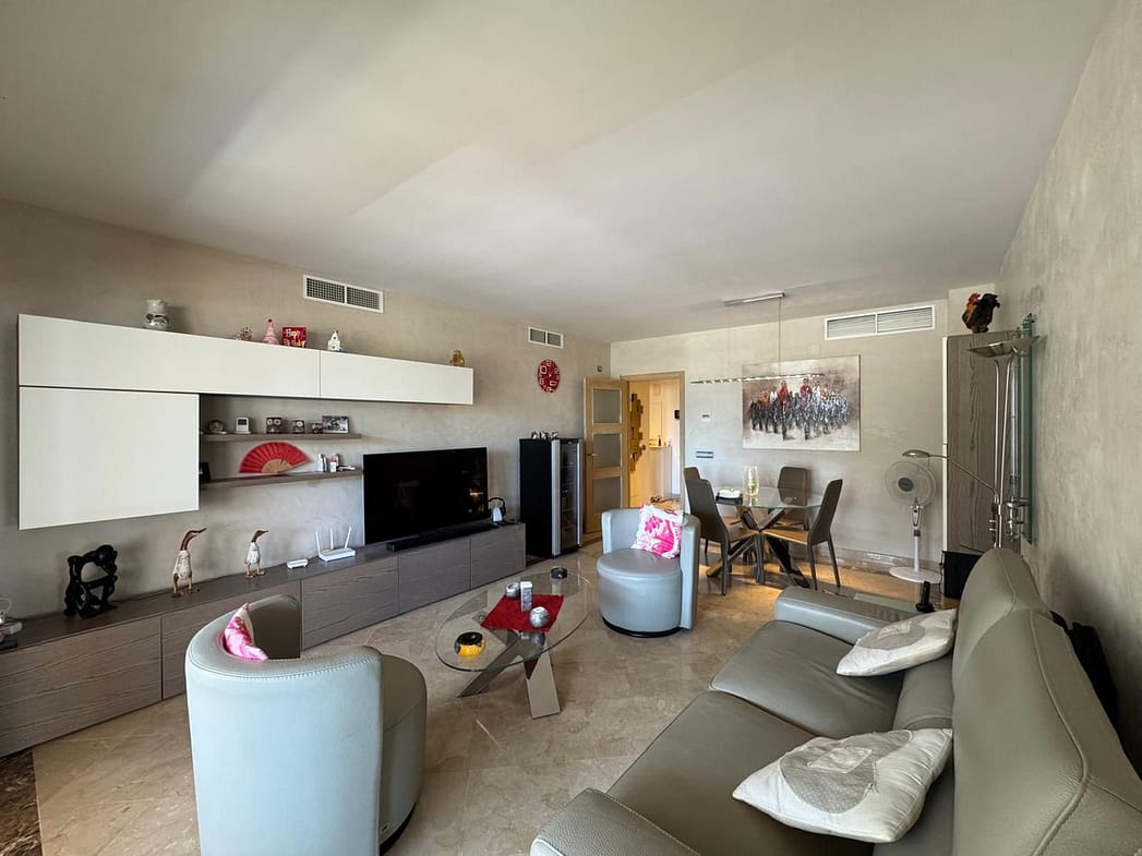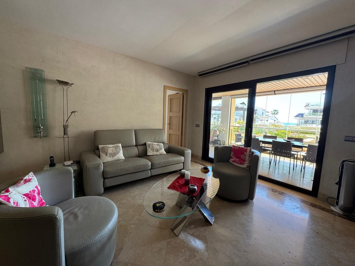 Magnificent 3 bedroom ground floor flat in the beautiful urbanisation of Marina Castillo, on the beachfront. A very nice flat, good qualities, with air conditioning hot/cold and home automation. The kitchen is independent with a small laundry room, we have 3 bedrooms with electric blinds and 2 complete bathrooms with electric towel rails, one en suite. The living-dining room, as well as the kitchen and 2 bedrooms have access to the large terrace of almost 70m2. The terrace is closed with glass curtains that allow you to enjoy your stay all day long and its corner location lets the sun in the morning until 13h but recovers it in the afternoon, a real pleasure. A quiet location, close to a rest area and with easy access to the communal swimming pool. The views are nice, some sea, garden and small Andalusian villaje complex….