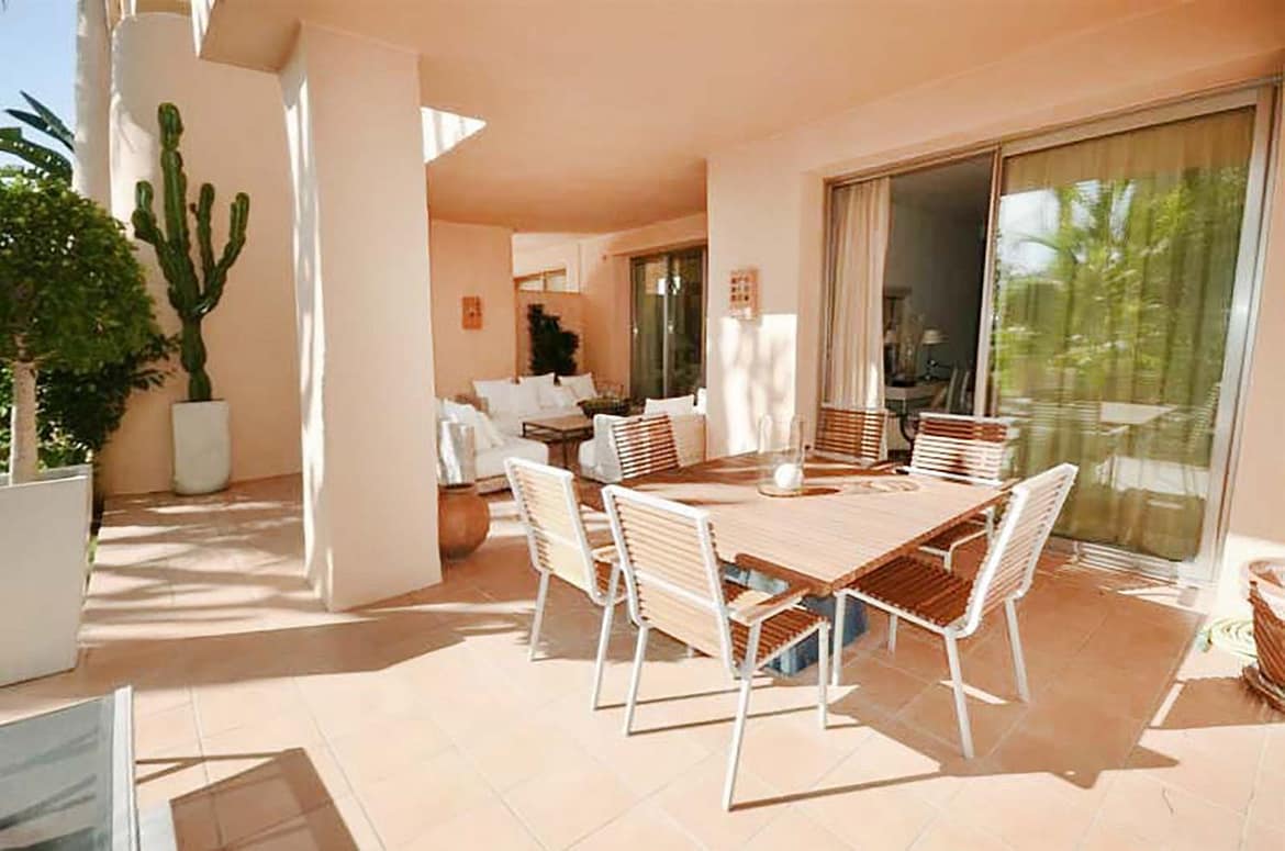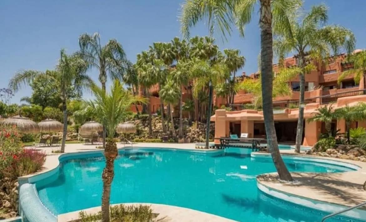 A stunning, south-facing, three-bedroom corner, and very private ground-floor apartment in the renowned Mansion Club, an exclusive gated community nestling in the foothills of Sierra Blanca. This development designed by leading architect, Melvin Villarroel is set in landscaped tropical gardens with walkways; lakes, pergolas, mosaics, and other exquisite features which give this development a marked Andalucian flavour. The accommodation comprises of an entrance lobby; spacious lounge and dining room with French windows leading out to a covered terrace; open plan fitted kitchen; utility room; two guest bedrooms sharing a bathroom; master bedroom with en-suite Jacuzzi bathroom. High-quality finishes and design, with underfloor heating throughout, hot and cold A/C and a video entry system. The complex is just a 20 minute walk to the Copper Tower on the Golden Mile and Marbella town.