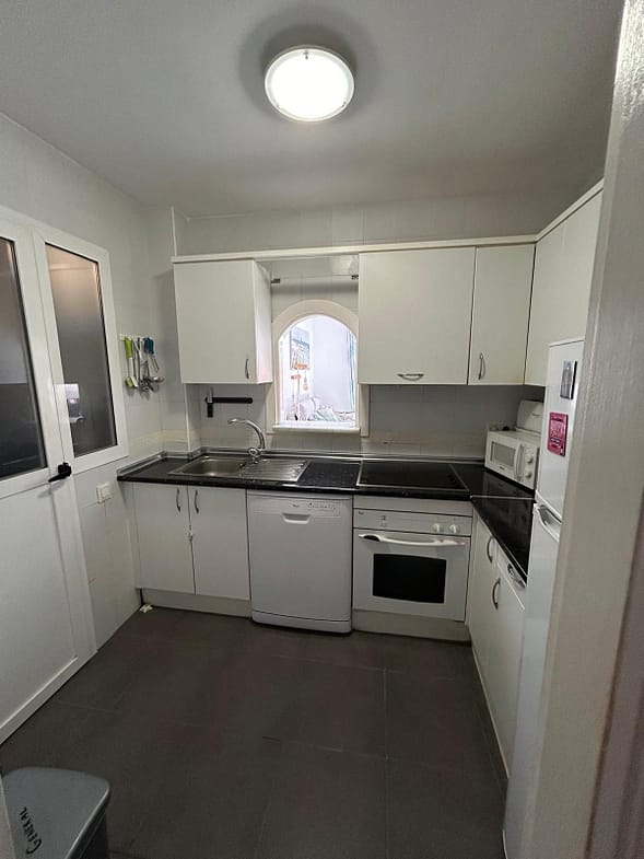 This spacious apartment features a master bedroom with en-suite bathroom, two additional double bedrooms, a second full bathroom, a fully fitted kitchen, and a separate utility room. The ground-floor setting offers both comfort and convenience, with easy access to the apartment’s outdoor areas. The sitting room leads out to a covered terrace and private garden with direct access to the communal pool area.