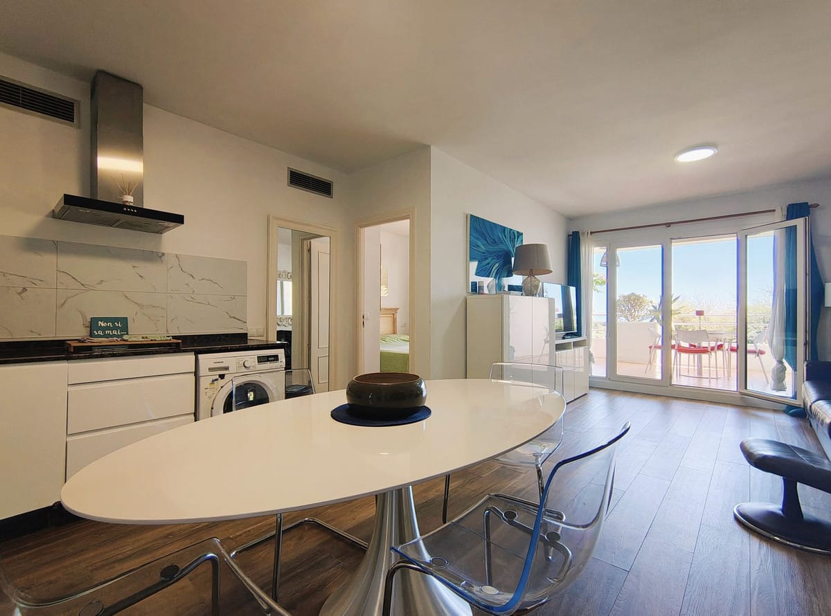 It offers a sunny south-facing terrace with sea views. Located in a quiet community,