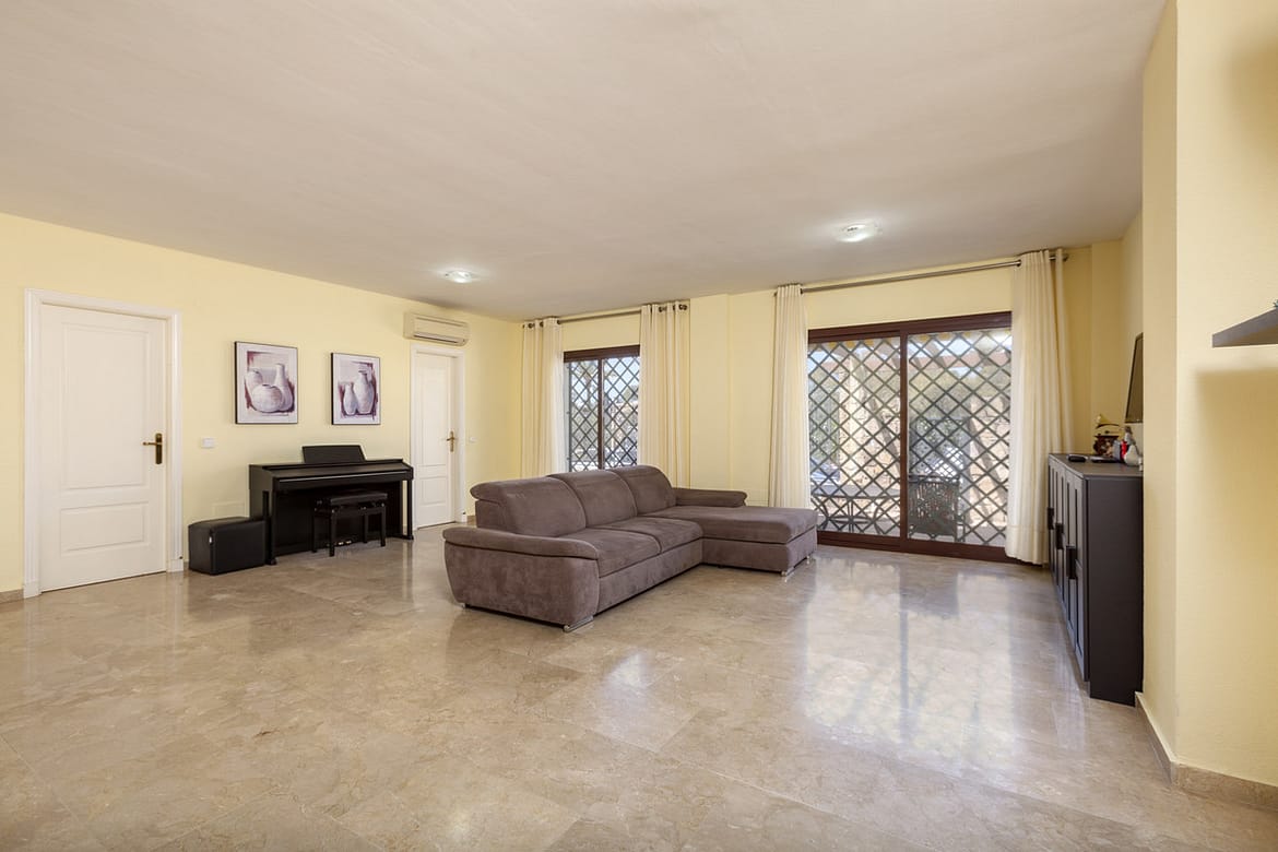 Lovely ground floor, West facing, three-bedroom apartment in the gated and well-established community Coto Real on Marbella's Golden Mile. The community boasts well-kept communal gardens and swimming pools and just a short drive to Marbella, Puerto Banus and all leisure amenities. This well-located property has; an open plan living and dining area; fully equipped kitchen with separate utility area and access to the large corner terrace which could be converted into a beautiful garden; three bedrooms; and two bathrooms. Other features include hot and cold air conditioning, marble floors, fitted wardrobes, storeroom, two private parking spaces and concierge service.