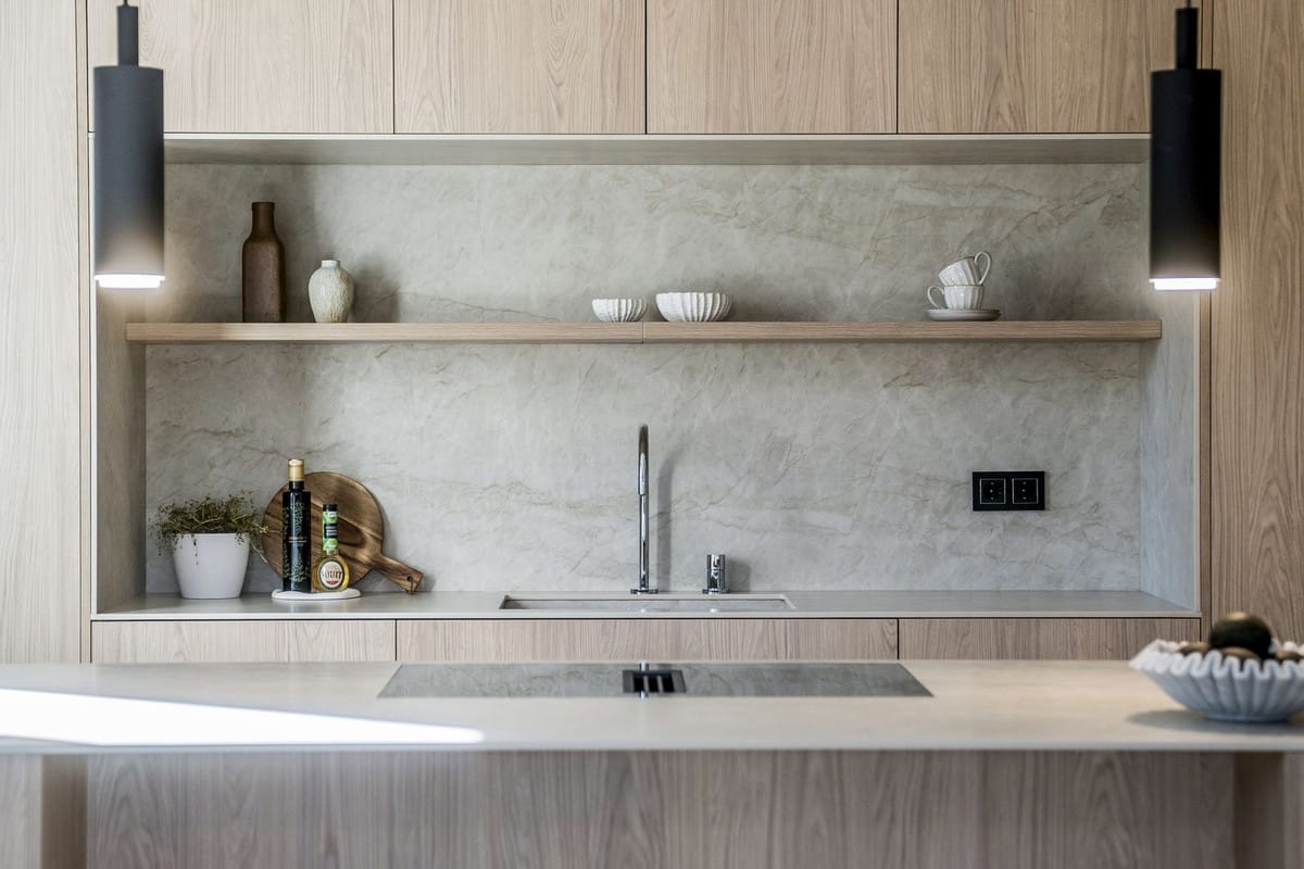 Entering the living area, you are greeted by a bespoke kitchen that exudes both elegance and functionality. It features stunning deep wooden accents on the island and cupboards, complemented by a soothing ‘Taj Mahal’ marble countertop. With ample storage, generous counter space, and a wine cooler, it is a modern kitchen that is incredibly functional for those who enjoy cooking and gatherings. The living room area is warm and inviting, featuring a majestic TV-wall with a spacious bench that offers ample storage.