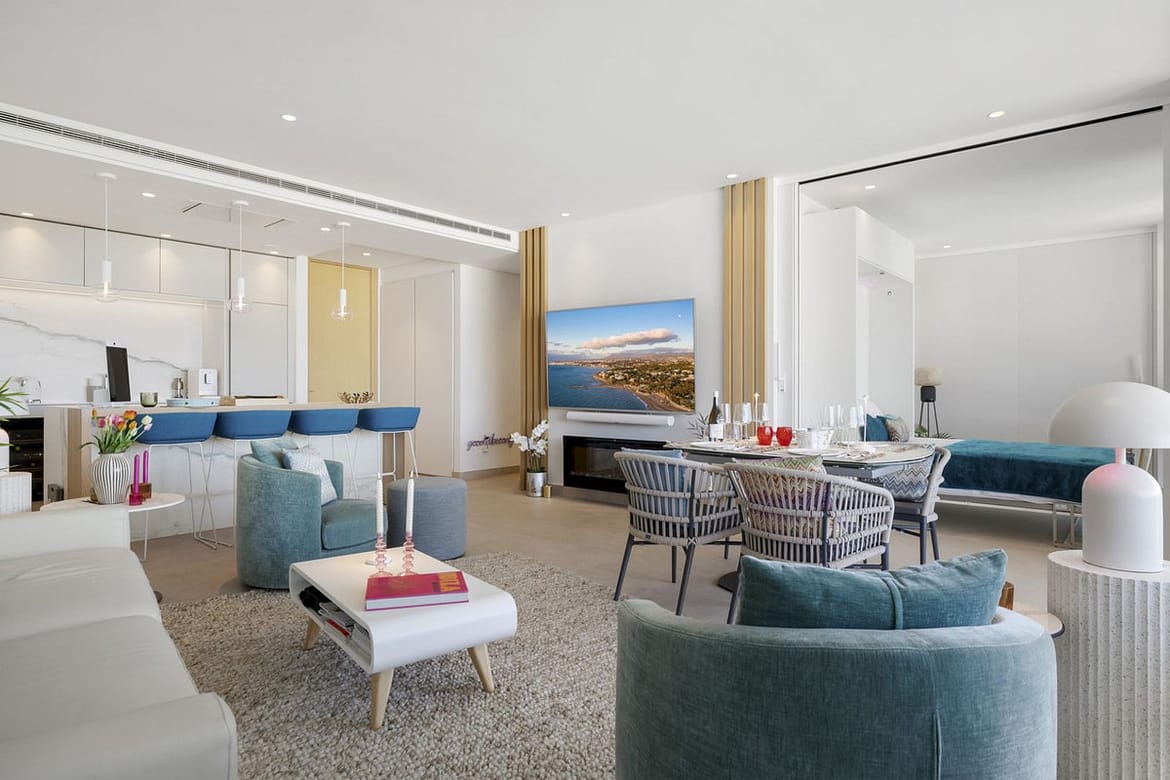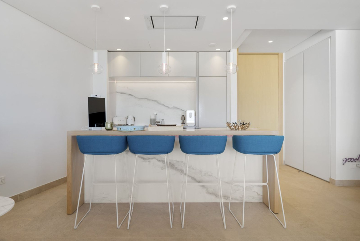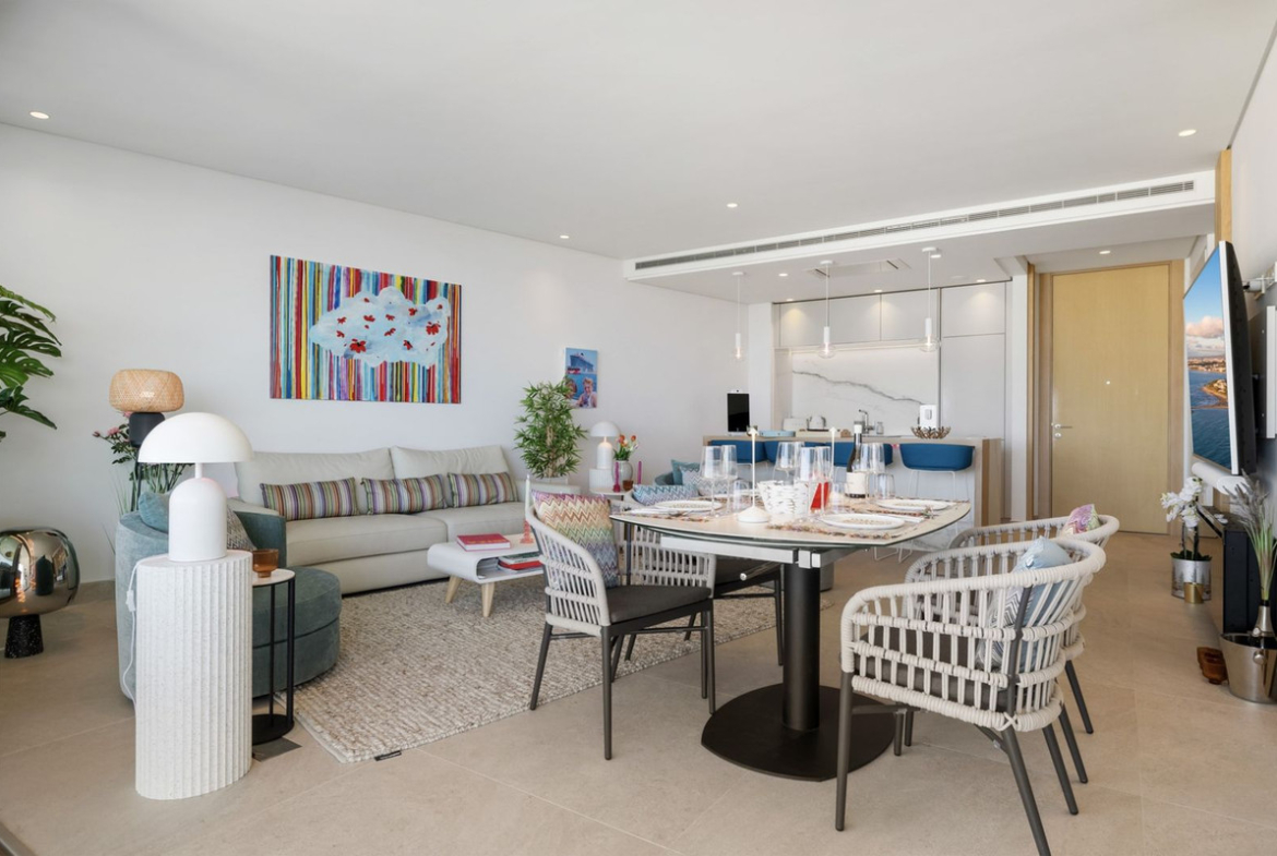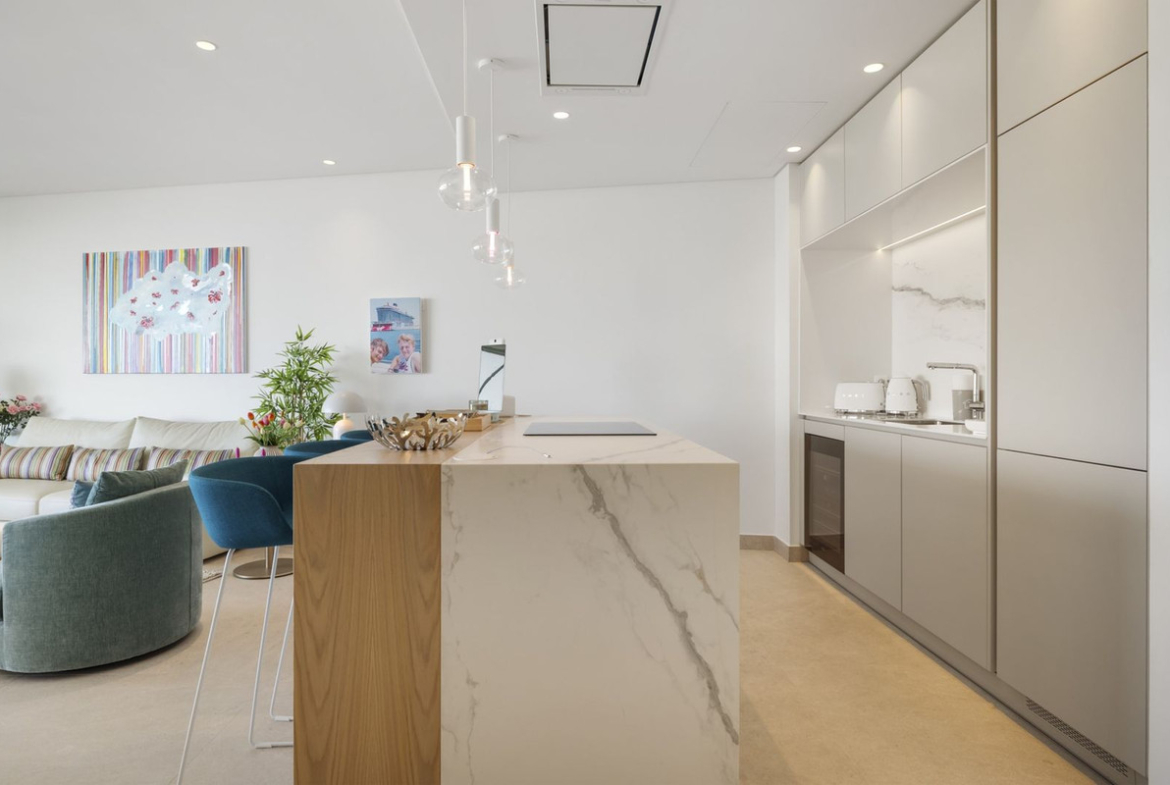 The apartment itself has an open-plan lounge, which seamlessly connects to the living, dining and kitchen areas, all bathed in natural light thanks to the floor-to-ceiling windows. The spacious layout creates an inviting 122 m2 space that is perfect for entertaining or relaxing while enjoying the unobstructed views of the Mediterranean coast.