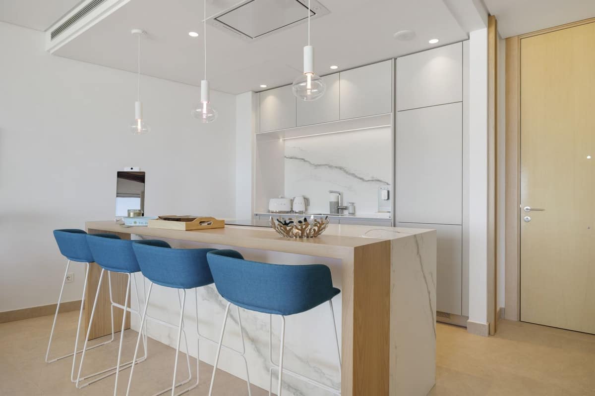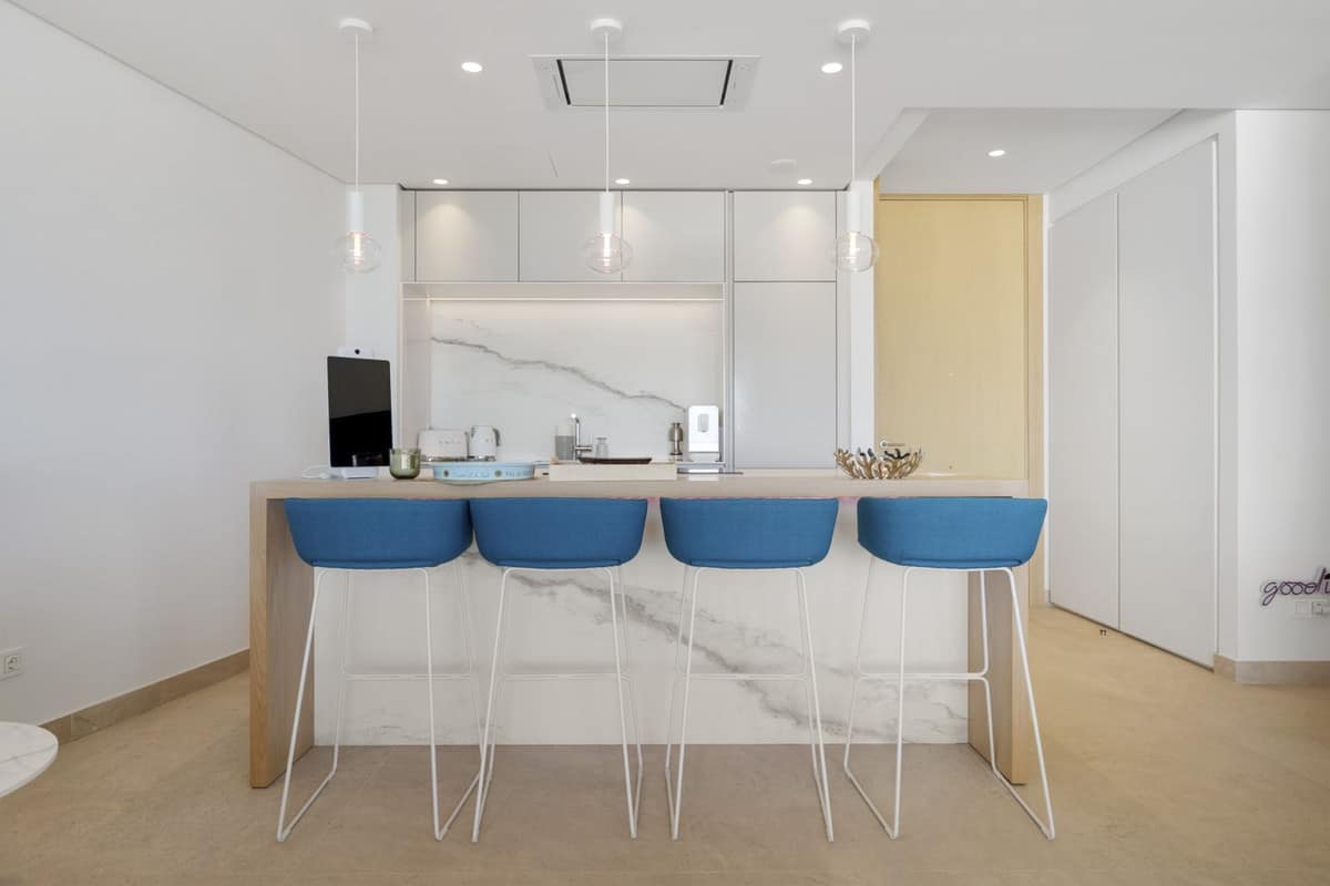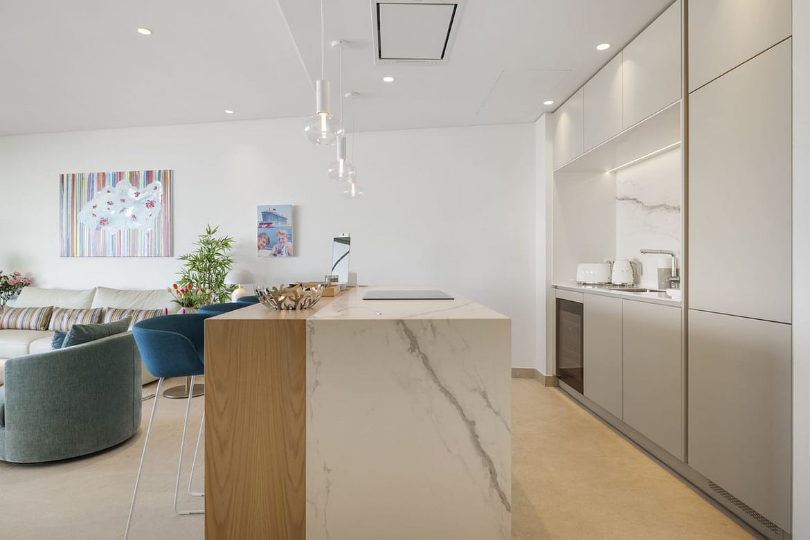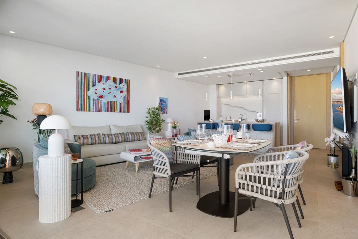 The apartment itself has an open-plan lounge, which seamlessly connects to the living, dining and kitchen areas, all bathed in natural light thanks to the floor-to-ceiling windows. The spacious layout creates an inviting 122 m2 space that is perfect for entertaining or relaxing while enjoying the unobstructed views of the Mediterranean coast.