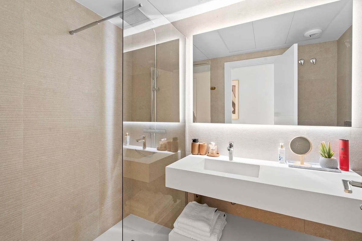 The apartment features three spacious bedrooms and two modern bathrooms, complemented by a bright living and dining area and a fully equipped kitchen. The property also benefits from two private parking spaces, included in the rental price.