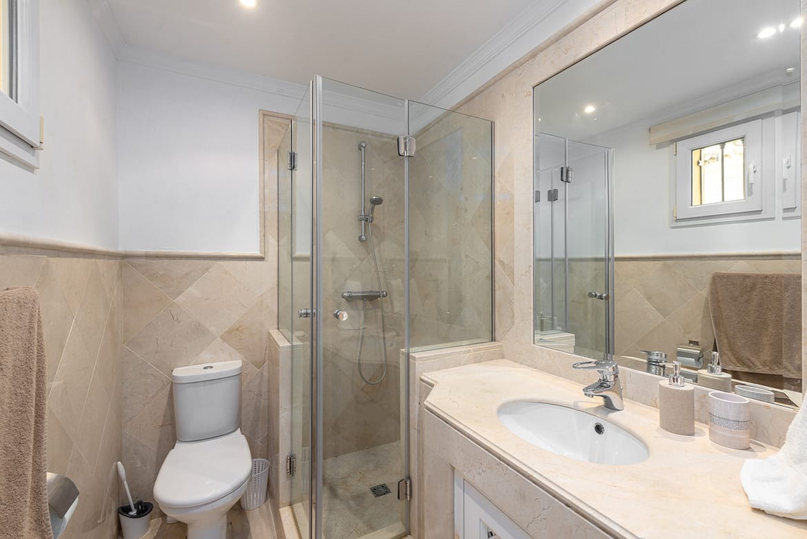 There are three double, en-suite bedrooms, all with built in wardrobes and private bathroom. There is an extensive terrace with sunshine for much of the day.