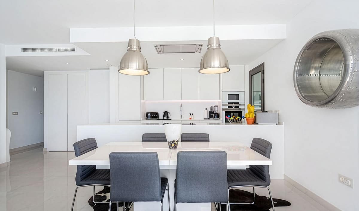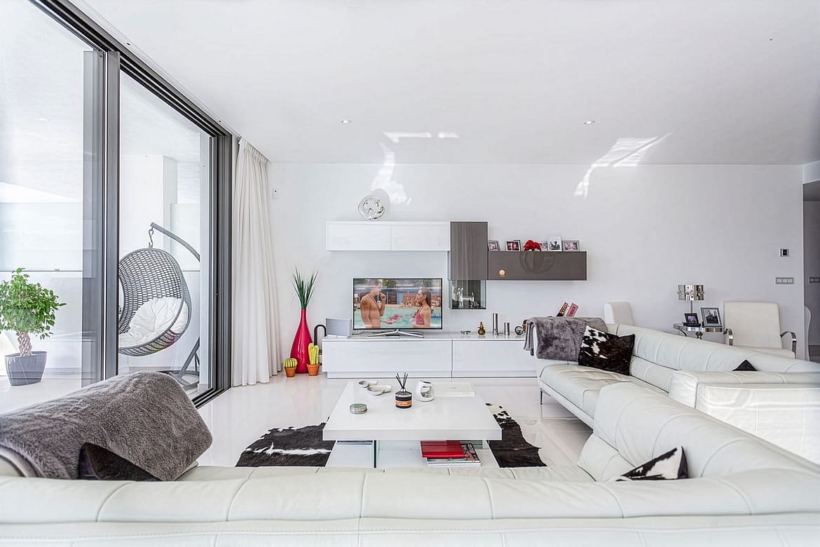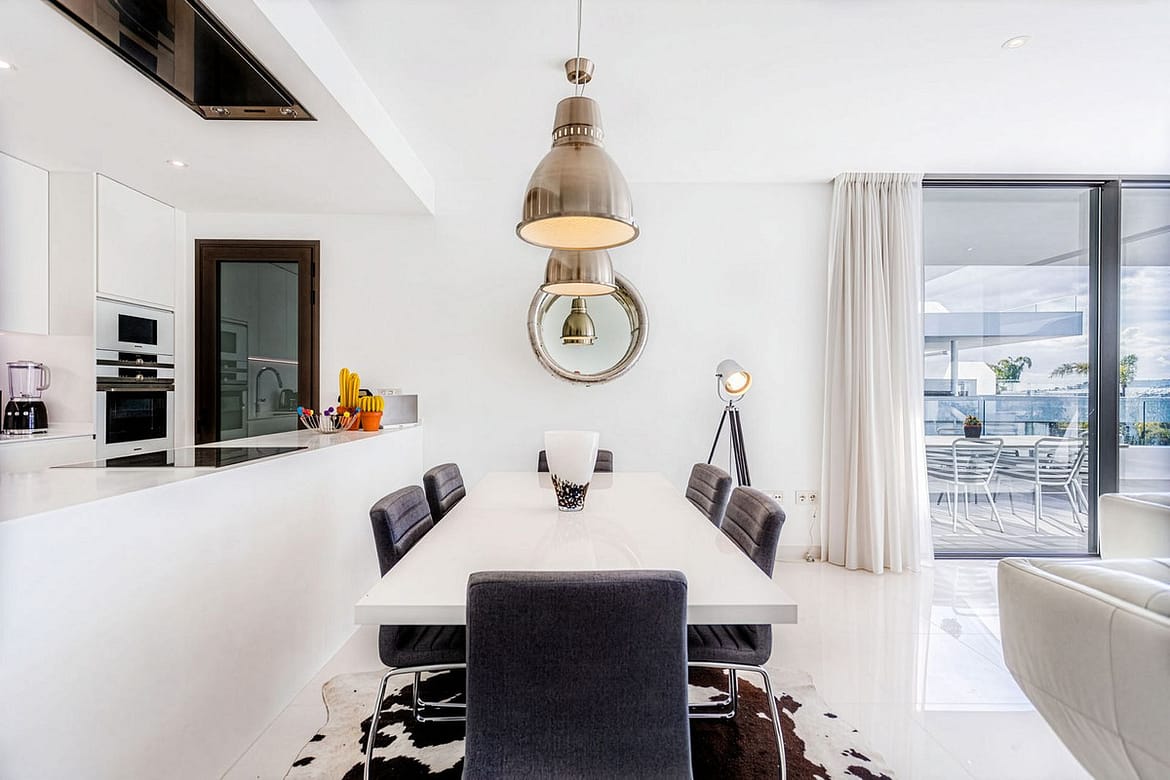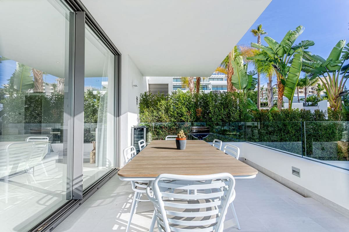 The apartment itself features a bright and spacious open-plan living area, enhanced by floor-to-ceiling sliding doors that flood the space with natural light and seamlessly connect the interior to a large west-facing terrace. This outdoor area is perfect for al fresco dining, entertaining guests, or simply enjoying the warm Mediterranean sunsets.