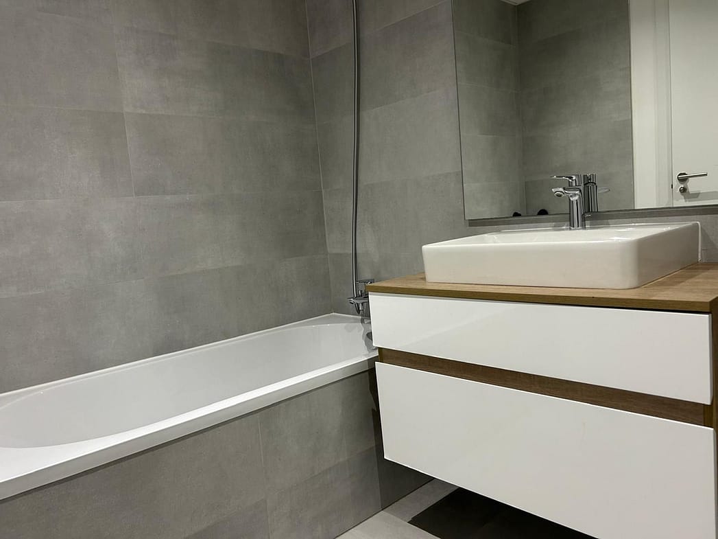 It features three bedrooms, and the modern American-style kitchen seamlessly connects with the bright living room, making it ideal for contemporary living.