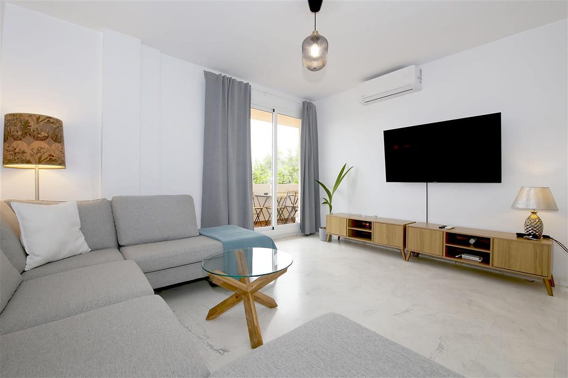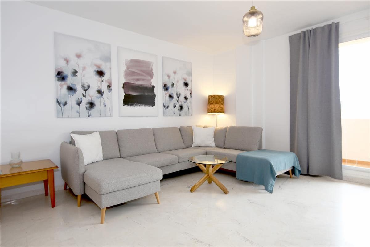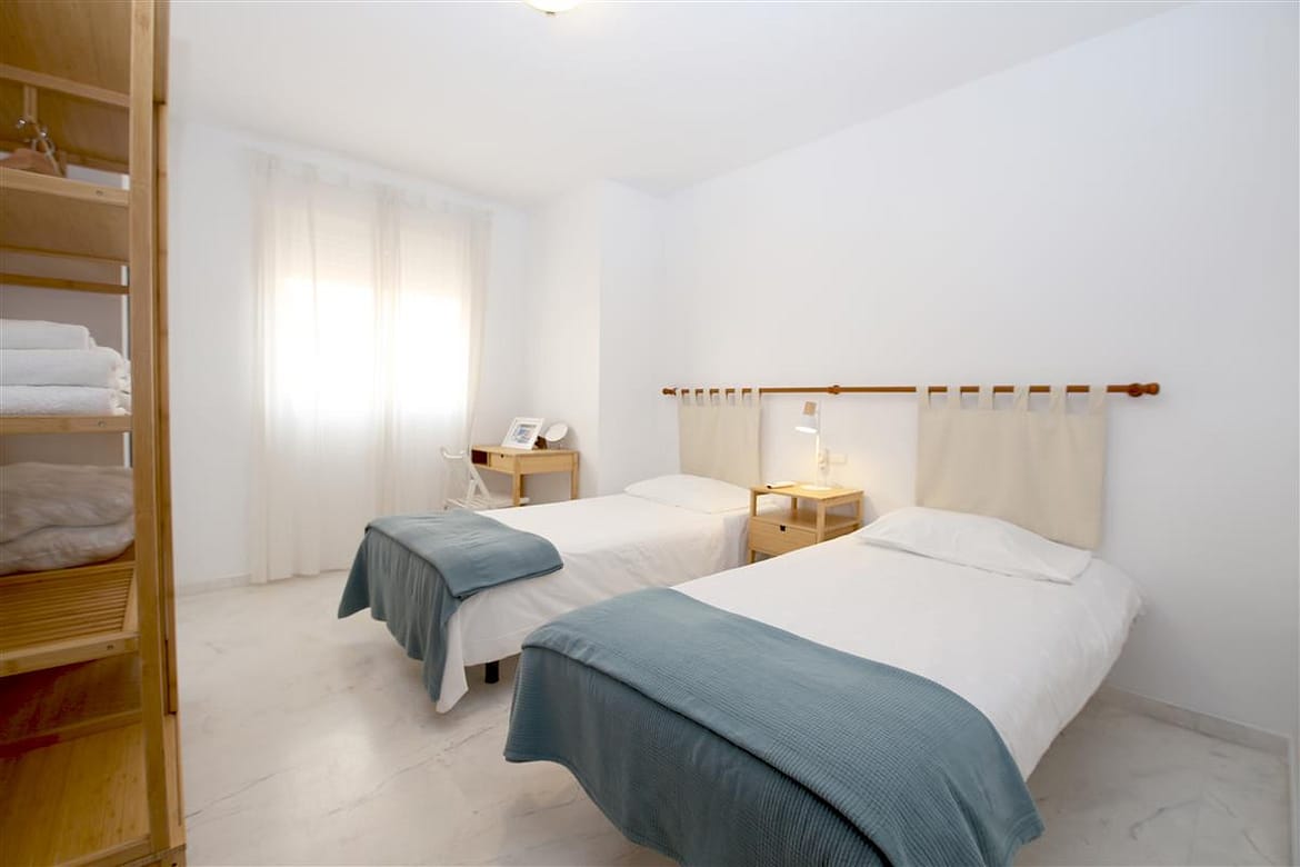 A refurbished and spacious holiday apartment that is perfect for families looking to relax near the beach or pool, close to the port and town centre. This property has three bedrooms, two bathrooms and a north-east facing balcony offering comfortable accommodation for up to six guests. The property includes a high speed fibre optic Wifi connection and independent air conditioning units in all bedrooms and living room. The bright and airy lounge is equipped with a lovely dining area plus a large sofa for six. The lounge area is equipped with a 55 inch flat-screen TV that offers plenty of international TV channels including Sky. The lounge opens onto the north-east facing balcony with a small dining set for six with stunning mountain and park views. The kitchen is fully equipped with all available appliances that you may need for your holiday along with a small laundry area with a washing machine. The en-suite master bedroom is equipped with a king-size bed (150×190 CM), 43 inch flat-screen with international channels with Sky and the bathroom includes a bath with overhead shower, WC and sink. The second and third bedrooms are twins and the beds may be joined up together to form a super king-size bed (180×180 CM) in each bedroom. There is also a family bathroom with a bath with overhead shower, WC and sink. The property includes a private underground parking space in the residential garage and the urbanisation provides a small community swimming pool that is open all year round (please enquire to confirm availability). All in all, a lovely property for a perfect family holiday close to Estepona port.