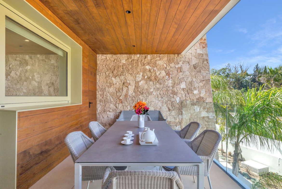 A second, northwest-facing terrace adjacent to the kitchen provides an additional outdoor space with a dining area and stunning mountain views, ideal for winding down with friends after a day at the beach or golf course.