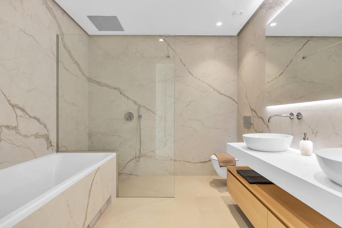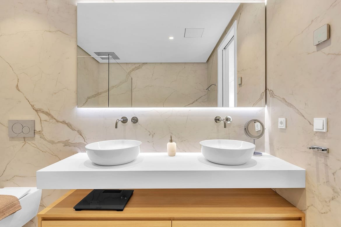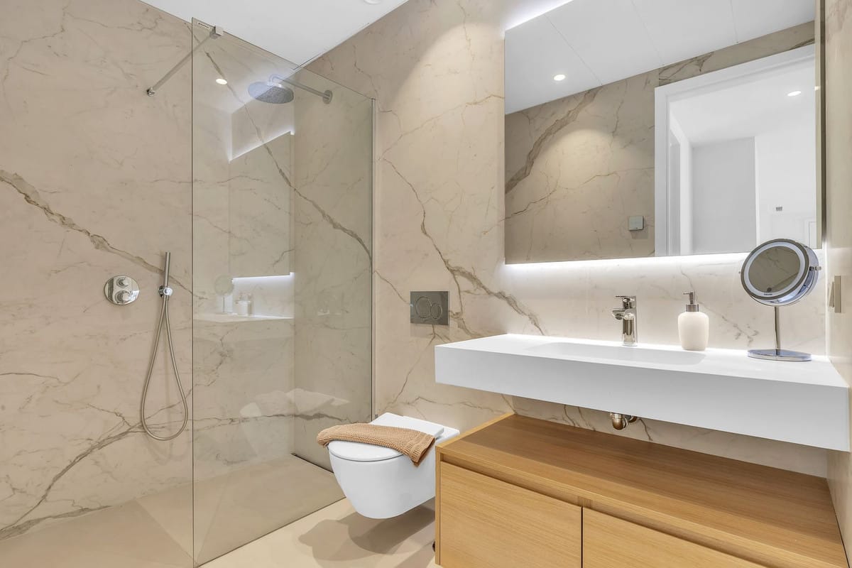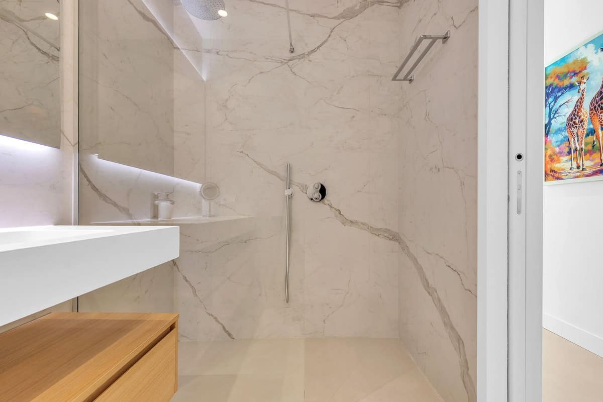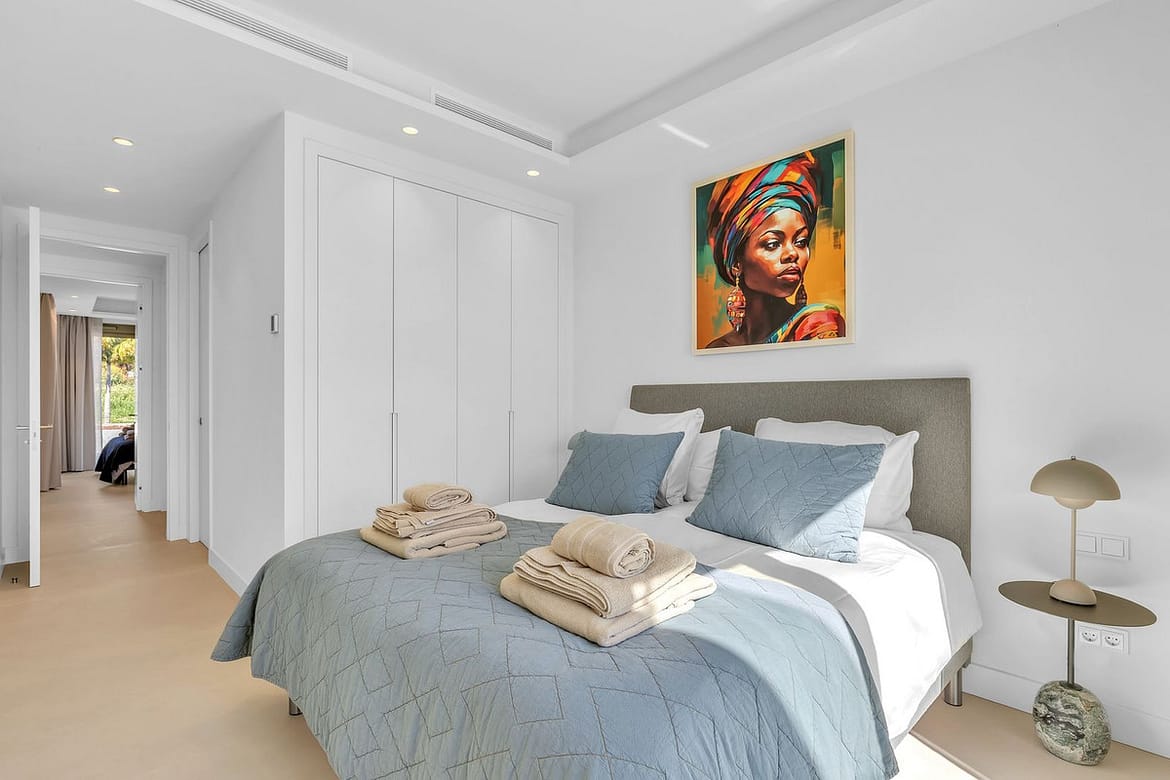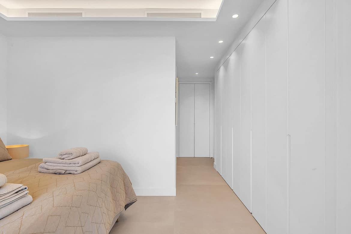 The master suite offers a peaceful retreat, luxurious white marble en-suite, and direct access to the main terrace. On the opposite side of the apartment, you’ll find two additional en-suite bedrooms, each thoughtfully designed with contemporary furnishings and ample wardrobe space.